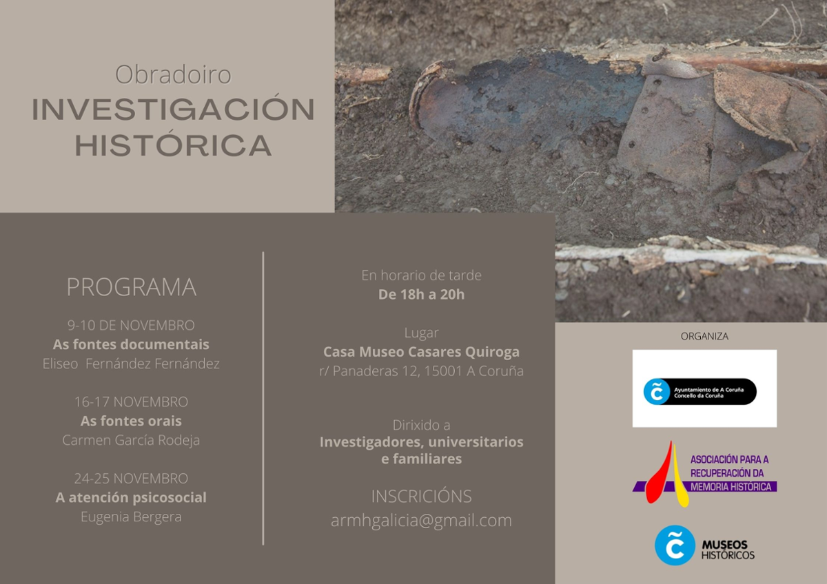 La ARMH (Asociación para la Recuperación de la Memoria Histórica), en colaboración con el Ayuntamiento de A Coruña convoa un programa de talleres de investigación histórica. Esta convocatoria llega después de mucho tiempo colaborando con familiares de personas desaparecidas, investigando sobre el mundo del exilio, trabajando sobre personas presas y sobre los métodos de represión. Viendo las dificultades para el trabajo, se lanzan estos talleres para dotar de herramientas para favorecer el proceso de investigación.