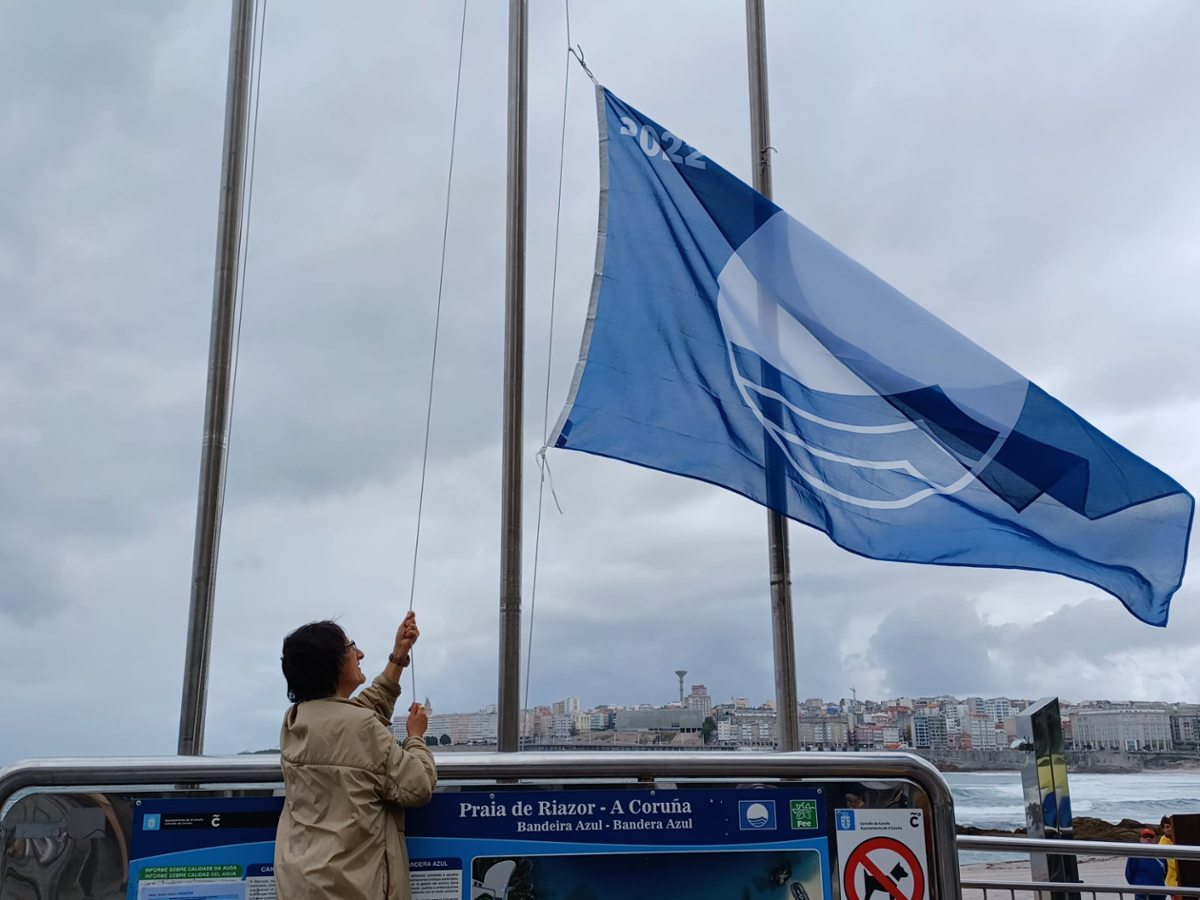 La concejala de Medio Ambiente y Sostenibilidad, Esther Fontán, izó hoy la bandera azul en la playa de Riazor, distintivo que ondea en el entorno del puesto de salvamento adscrito a este arenal de la ciudad.