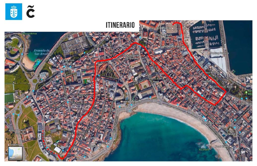 Desde las 18.00 horas, la cabalgata discurrirá desde la Ronda de Monte Alto, Avenida de Hércules, calle de A Torre, Panaderas, Orzán, San Andrés, Santa Catalina, Cantón Grande, Avenida de la Marina y de Montoto, para finalizar, hacia las 20.00 horas, en la Plaza de María Pita, donde la comitiva será recibida por el alcalde de A Coruña, Xulio Ferreiro. A continuación, el regidor acompañará a los Reyes Magos al balcón municipal, desde donde se dirigirán, con el Saludo Real, a las niñas y niños que se encuentren en la plaza.