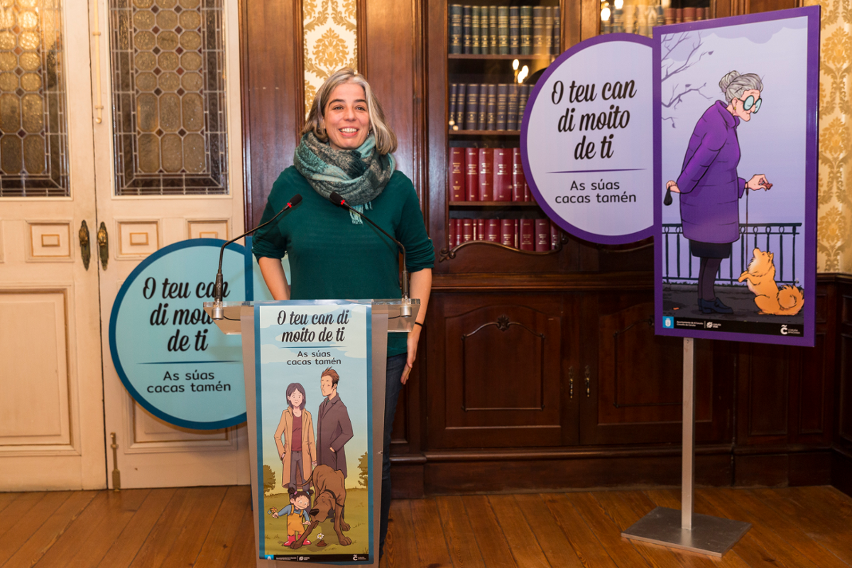La concejala de Medio Ambiente, María García, presentó este jueves la campaña O teu can di moito de ti, dirigida a sensibilizar a los y a las dueñas de perros de su responsabilidad en el cuidado del espacio público en relación con los excrementos de sus animales, "de cara a facilitar la integración y convivencia armónica en la ciudad". De este modo, el Ayuntamiento instalará desde esta semana señales con ilustraciones -obra de Xulia Pisón, dentro de la apuesta del gobierno coruñés por la creación local- en un total de 52 espacios repartidos por toda la ciudad, como son los parques de San Pedro, Bens, Vioño o Santa Margarita, a la plaza Elíptica de los Rosales, el parque infantil de las Conchiñas, Cuatro Caminos, avenida de Nuevo Mesoiro, el entorno del mercado de Elviña, los jardines de Méndez Núñez o Paseo de los Puentes, entre otros lugares en los que se da cita vecindario con animales. Esta señalización, que se prolongará en los primeros meses del 2018, tendrá acompañamiento en las redes sociales, y contará con otro tipo de acciones que se irán desvelando en las próximas semanas.