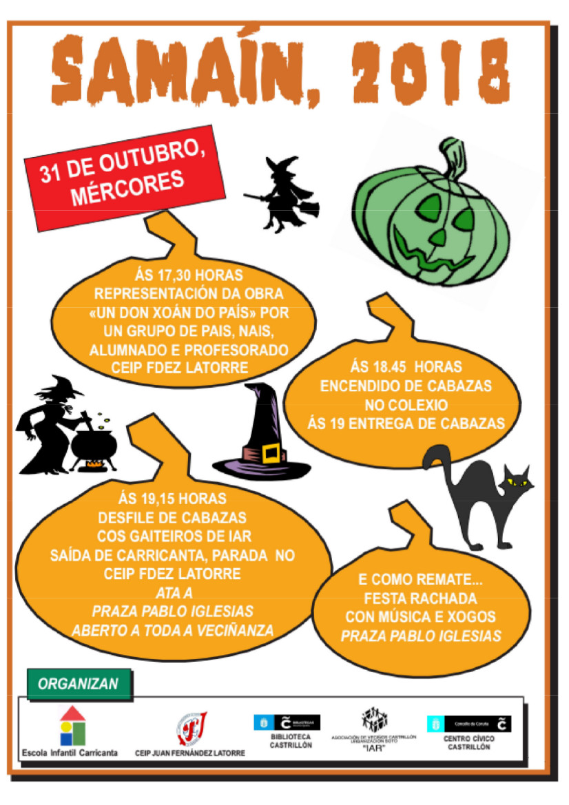 A las 18:45 horas se hará un encendido de calabazas en el colegio y media hora más tarde comenzará el desfile de calabazas con los gaiteros de Iar, saliendo de la EIM Carricanta, con parada en el CEIP Fernández Latorre, hasta la plaza de Pablo Iglesias, con una fiesta con música y juegos como final final. Esta actividad estará abierta a toda el vecindario.