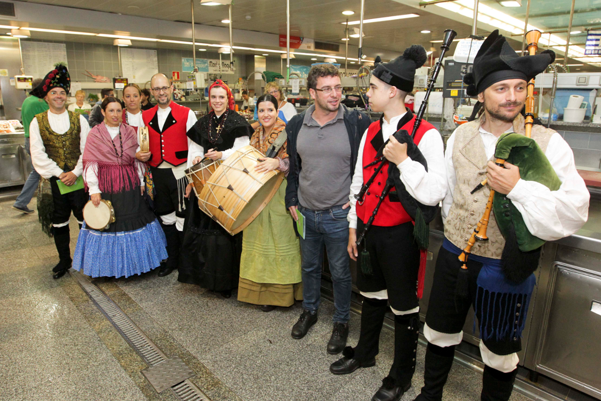El concejal de Culturas, Deporte e Coñecemento, José Manuel Sande, estuvo en la mañana de este jueves en el mercado Eusebio da Guarda, en la plaza de Lugo, que acogió una de las actividades asociadas a la Romería de Santa Margarita que este fin de semana culmina la programación de las fiestas de María Pita, como fue la actuación, dentro de la propia plaza de abastos, de las asociaciones culturales Donaire y Son d'Aquí. Los preparativos de la romería ya se dejan ver desde principios de semana en el entorno de los cuatro emplazamientos por los que se distribuirán las actividades del sábado, que se repartirán entre el parque de Santa Margarita y cuatro nuevos emplazamientos, como son las plazas de Lugo, Vigo, Ourense y los Jardines de Méndez Núñez. Desde el lunes, los escaparates de una treintena de negocios de la zona centro, lucen distintos elementos relacionados con la cultura tradicional, desde trajes hasta instrumentos musicales, para "ir haciendo ambiente y crear un escaparate vivo, y dentro del objetivo de dinamizar y dar visibilidad a la cultura tradicional de una manera muy visual", según explica el concejal. En esta exposición se cuentan, entre otras piezas, con media docena de piezas de una colección de trajes tradicionales en distintos comercios de la zona centro.