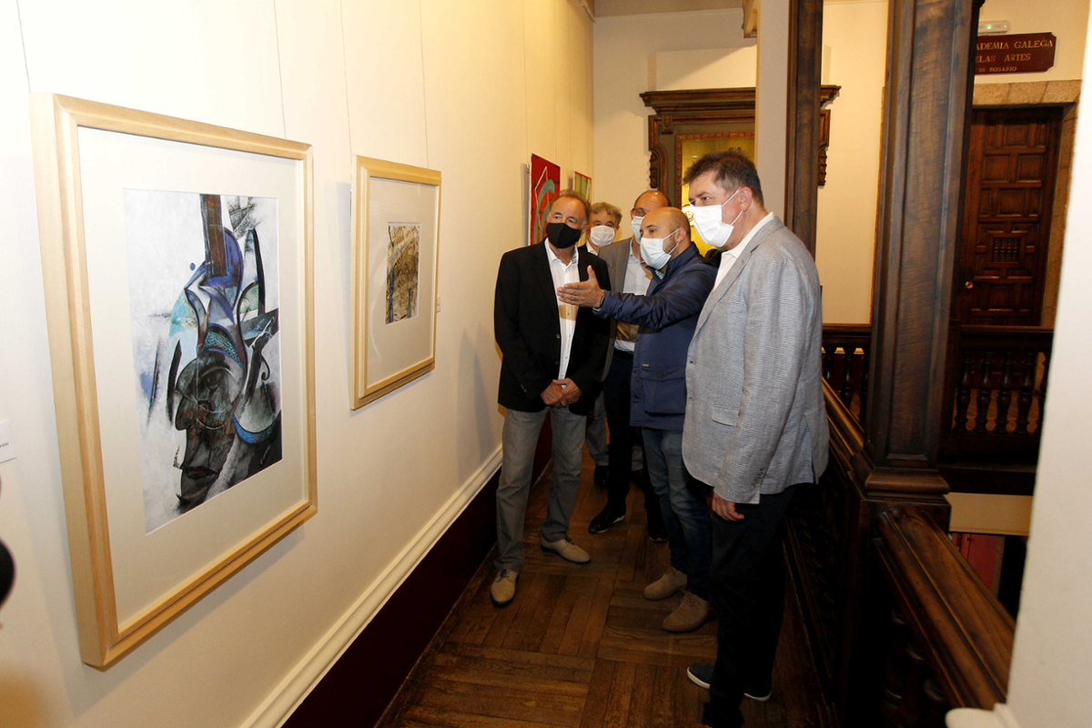 El concejal de Turismo, Juan Ignacio Borrego, acudió esta tarde a la inauguración de la exposición itinerante "Facer camiño", en la sede de la Real Academia Gallega de Bellas Artes, en un acto en que también participaron el presidente de la institución, Manuel Quintana Martelo, y el conselleiro de Turismo en funciones, Román Rodríguez. La muestra, que se enmarca en el programa del Xacobeo 2021, está compuesta por 23 piezas entre pinturas, esculturas y fotografías, que se inspiran en el Camino de Santiago. Manuel Buciños, Ignacio Basallo, Xosé Díaz, Menchu Lamas, Xurxo Lobato, Acisclo Manzano, Dicen Matamoro, Manolo Paz, Soledad Penalta, Manuel Quintana Martelo, Rafael Úbeda y Miguelanxo Prado forman parte de esta colectiva que está recorriendo toda Galicia.