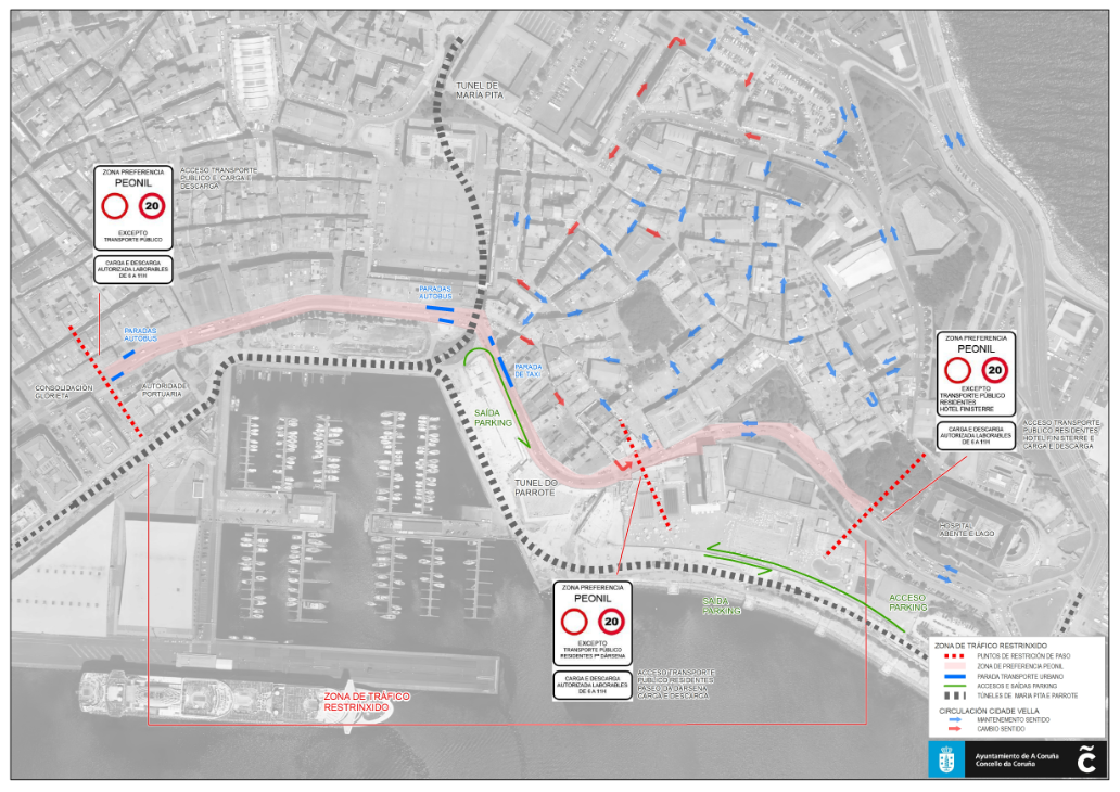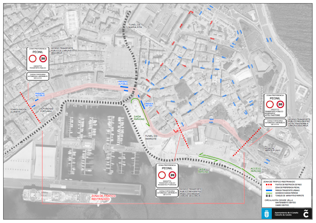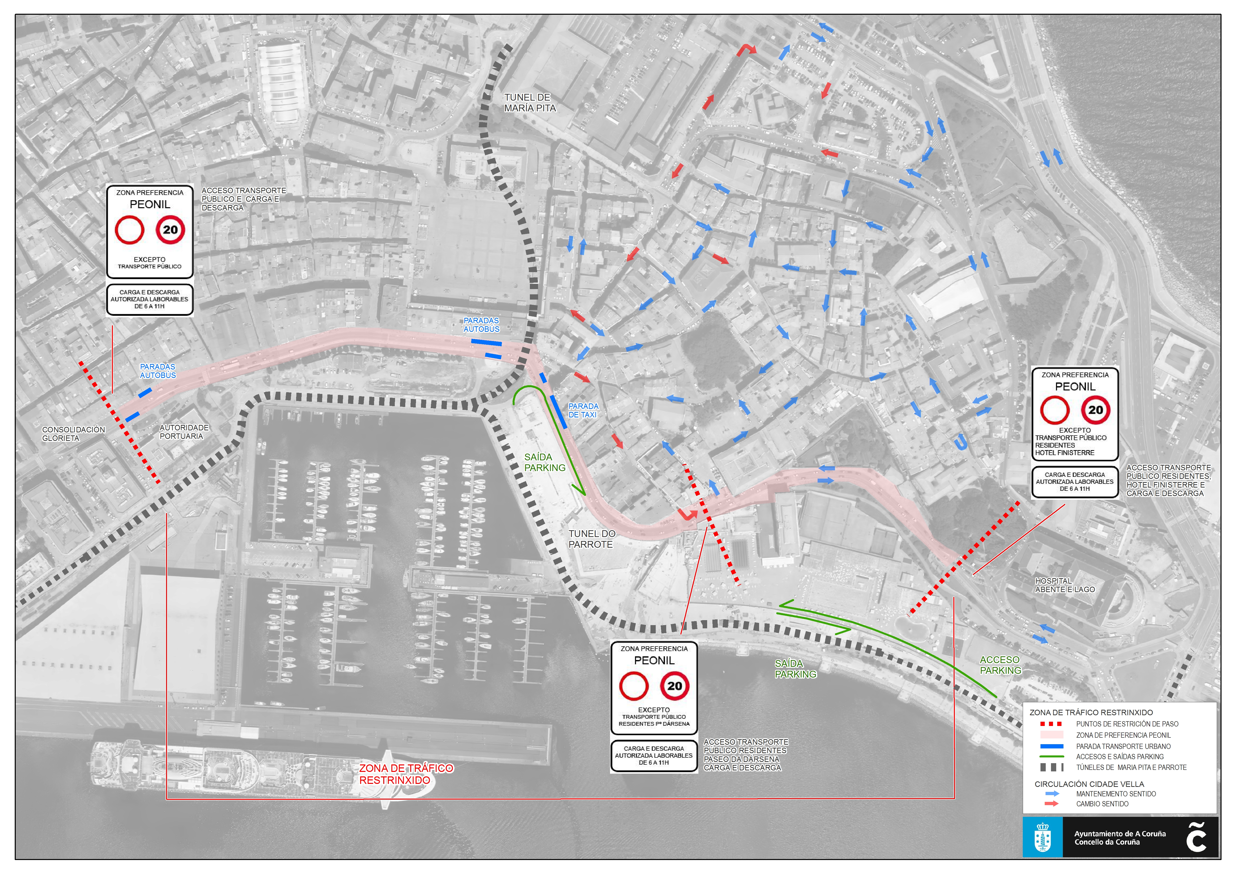 La Concellería de Mobilidade Sostible informa también de que los vehículos procedentes de la avenida de Arteixo que deseen acceder a la Ciudad Vieja a través del túnel del Parrote deben hacerlo tomando Juan Flórez y llegar a la avenida Linares Rivas por la calle Marcial del Adalid. Una vez en Linares Rivas, podrán acceder a la avenida do Porto desde la plaza de Ourense.
