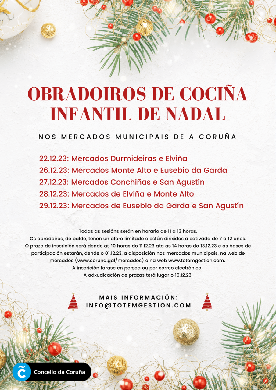 Los Mercados Coruñeses organizan una serie de talleres de cocina infantil de Navidad que se celebrarán del 22 al 29 de diciembre, de 11 a 13 horas.