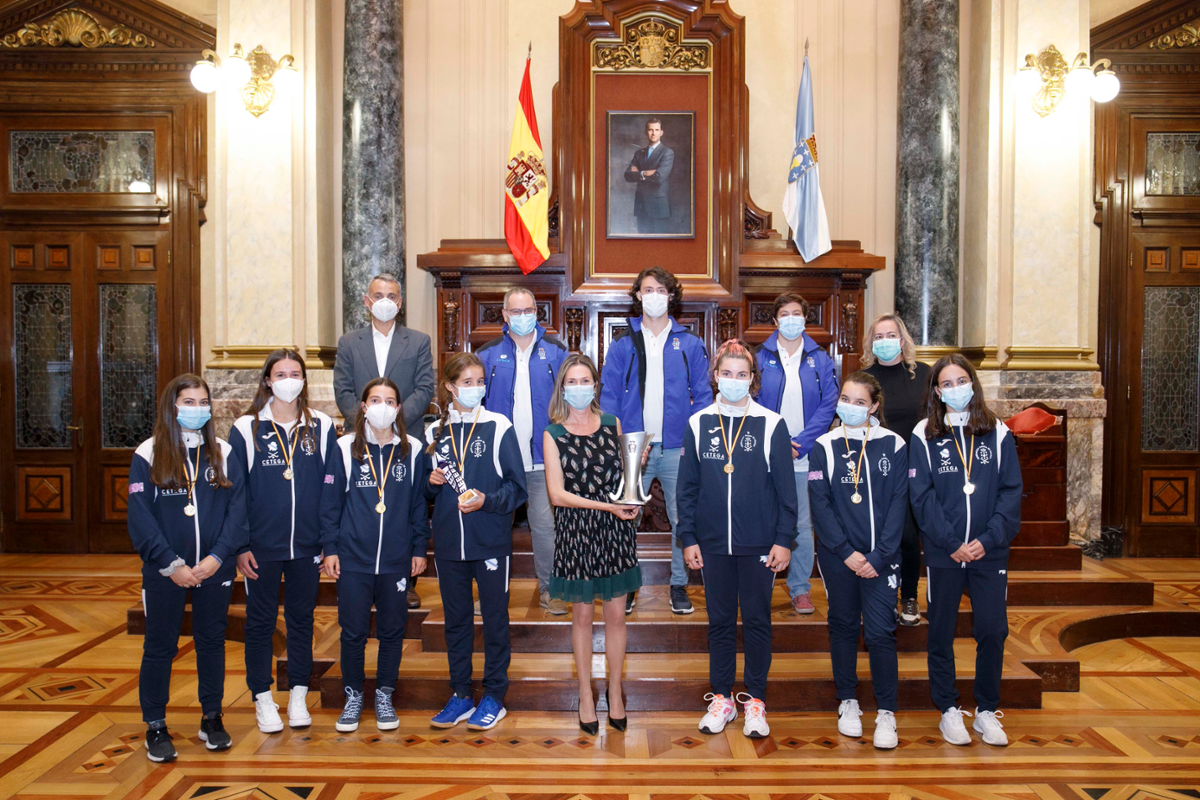 A concelleira de Deportes, Mónica Martínez, recibiu no concello as xogadoras coruñesas de hóckey herba SUB-14, que gañaron coa selección galega o campionato de España no pasado mes de marzo. A edila deulles a noraboa tanto ás deportistas Marta, Inés, Docha, Lola, Noa, Alba e Ainara como ao persoal técnico do Centro de Tecnificación de Galicia na Coruña: Álvaro Rodríguez, Estíbaliz Arrugaeta e Ángel Iglesias. Martínez estivo acompañada da delegada da Coruña da Federación Galega de Hóckey, Yolanda Casanova, e do responsable da Promoción da Federación Galega Hóckey, Roberto Baratta.