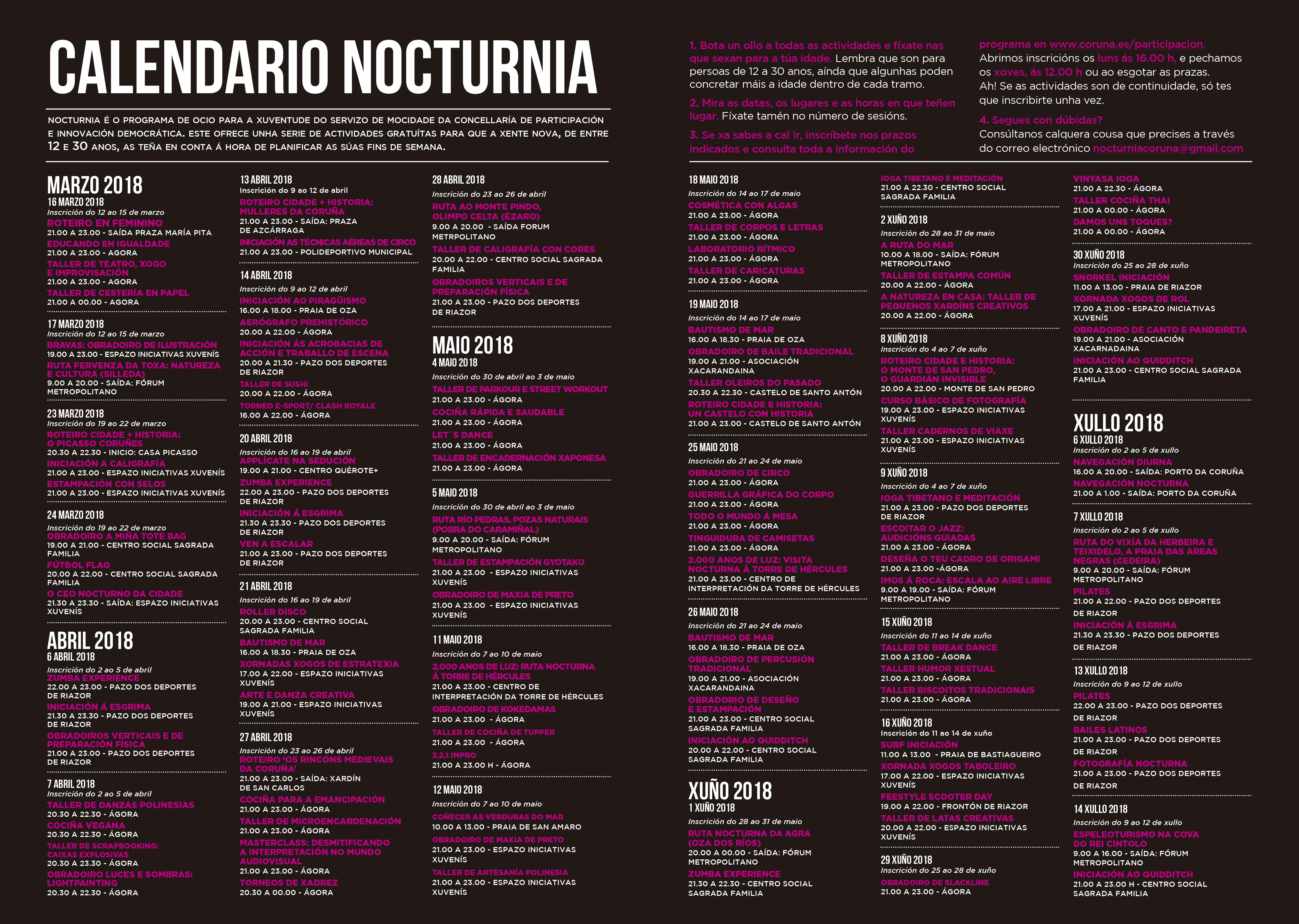Como es habitual, el plazo de inscripción se abrirá el lunes previo al fin de semana de actividad, contra alas 16.00 horas, en el espacio web municipal del Centro Municipal de Información Juvenil (CMIX), http://www.coruna.gal/cmix, y se cerrará los jueves a las 12.00 horas, o hasta que se agoten las plazas de las distintas propuestas. En esta misma página se podrá encontrar toda la infomación relativa al programa de ocio, así como de la propia revista de cultura y ocio de Nocturnia, Coruña Mutante, cuyo séptimo número presentó la concejal. El texto, que contará con una tirada de 5.000 ejemplares, se podrá encontrar, a partir de los próximos días, en los distintos recintos municipales --bibliotecas, centros cívicos, museos científicos, instalaciones deportivas, espacios socioculturales como Ágora y Fórum-- y centros educativos coruñeses.
