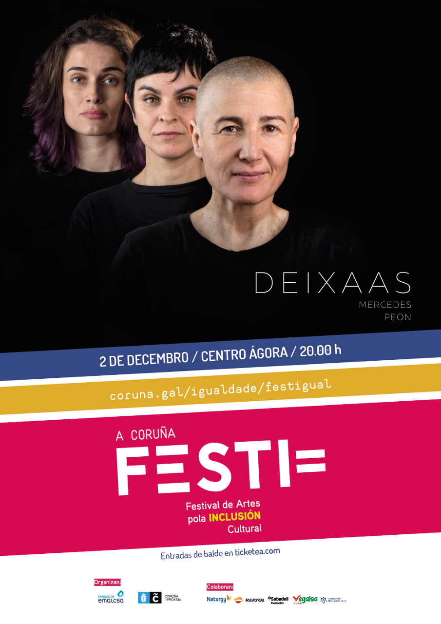 O Festival de Artes pola Inclusión Cultural Festi= finalizará o vindeiro domingo, 2 de decembro, a súa segunda edición. A iniciativa, impulsada polo Concello da Coruña a través da Fundación Emalcsa, leva desde o mes de outubro ofrecendo actividades 100% libres de barreiras a través da súa programación expandida por toda a cidade. Este domingo chegará ao seu fin cunha xornada festiva e de balde que comezará ás 11.00 horas que e rematará cun concerto de Mercedes Peón a partires das 20.00 horas.