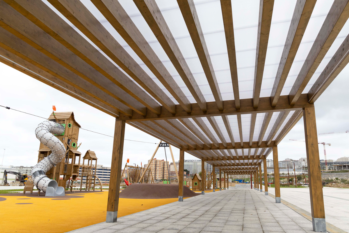 Na contorna do parque, e ao ancho e longo da explanada da praza, dispuxéronse, ademais, diversas áreas de lecer, con tres pérgolas de distinto tamaño. Tamén se plantaron árbores e arbustos, reverdecendo así este novo espazo público do barrio. Neste sentido, a mediados do mes de novembro remataron os traballos correspondentes á xardinaxe e pavimentado, así como as actuacións asociadas á posta en servizo da iluminación pública. E, xa esta semana, ultimouse a colocación do novo mobiliario urbano, o que permitiu completar esta intervención para deixar a praza xa operativa para as veciñas e os veciños.