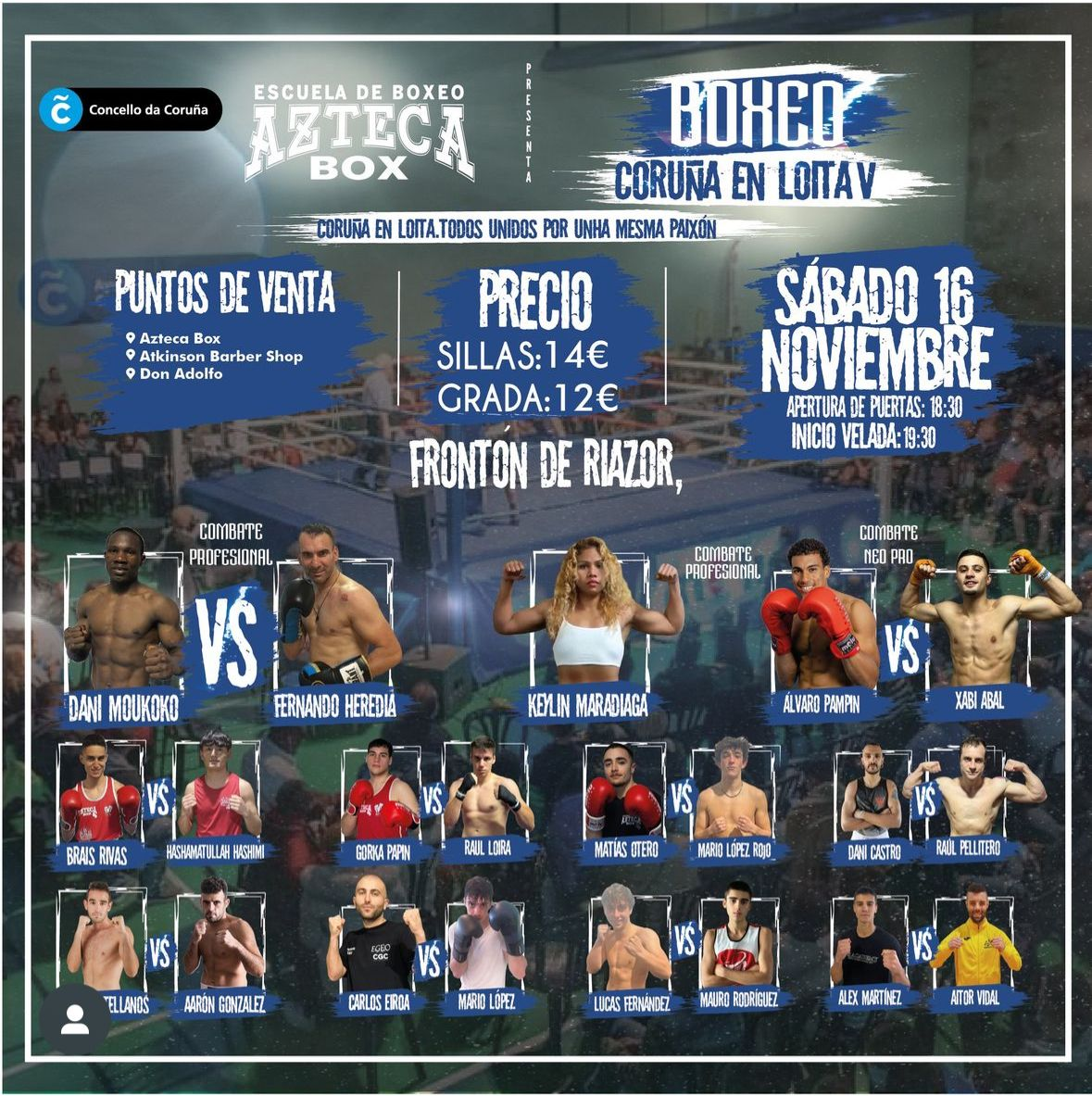 O Frontón de Riazor acollerá o vindeiro sábado 16 de novembro a partir das 19.30 horas a quinta velada de boxeo Coruña en Loita, que organiza a escola de boxeo Azteca Box e conta coa colaboración do Concello da Coruña. As entradas para o evento xa están á venda en Azteca Box, Atkinson Barber Shop e Don Adolfo.