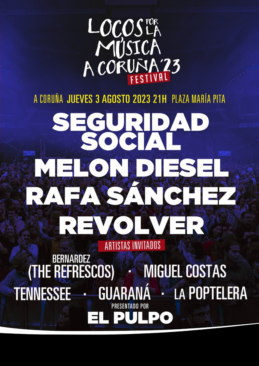 O Concello da Coruña reunirá mañá, xoves 3 de agosto, a diferentes bandas e artistas en concerto no marco das 'Noites de María Pita'. Baixo o nome de 'Locos Coruña', agruparanse nomes do panorama nacional como Seguridad Social, Melón Diesel, Rafa Sánchez e Revólver como parte da programación musical deseñada polo Goberno de Inés Rey para a celebración das Festas de María Pita 2023.