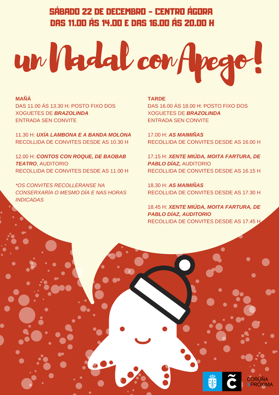 A festa de Nadal do programa Apego desenvolverase no Centro Ágora o día 22, en horario de mañá e tarde (de 11.00 a 14.00 e de 16.00 a 20.00 horas) e nela haberá actividades de música e contos para os e as nenas. Comezará Uxía Lambona e a Banda Molona, para crianzas maiores de 3 anos, ás 11.30 horas. A continuación Baobab Teatro representará Contos con Roque, ás 12.00 horas. Xa pola tarde, haberá dous pases de As Maimiñas, un ás 17.00 e outro ás 18.30 horas e outros dous pases de Xente miúda, moita fartura, de Pablo Díaz, un ás 17.15 e outro ás 18.45 horas. Ademais, durante o día haberá un posto fixo de xoguetes de Brazolinda na aula 7 do Centro Ágora. As entradas para as actuacións son gratuítas pero limitadas pola capacidade dos recintos en que se van desenvolver. Repartiranse na conserxería do Centro Ágora unha hora antes do comezo de cada actividade.