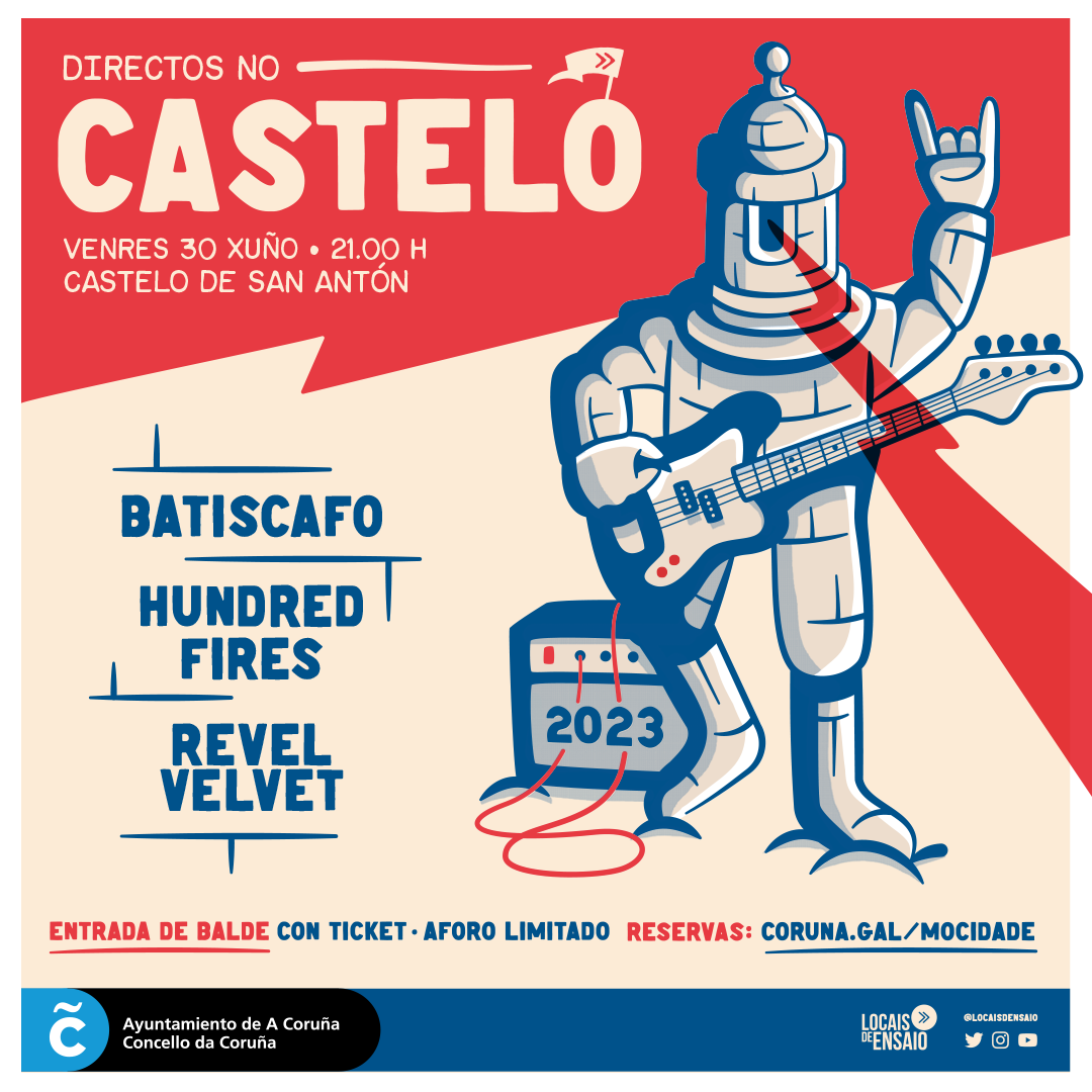 Serán tres os grupos usuarios dos Locais de Ensaio do Concello da Coruña os que participarán, a partir das 21.00 horas, nesta ocasión: Batiscafo, Hundred Fires e Revel Velvet. Se ben todos estes proxectos parten da etiqueta pop-Rock, cada un deles amosará enriba do escenario os matices que os definen.