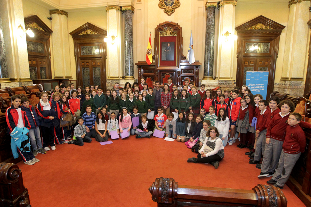 El alcalde de A Coruña, Xulio Ferreiro, presidió hoy un Pleno Infantil, en el que respondió a las preguntas que le formularon 46 niños y niñas de ocho centros de la ciudad. La concejala de Xustiza Social e Coidados,  Silvia Cameán, también estuvo presente en este acto, organizado en colaboración con Unicef y con motivo del 26 aniversario de la Convención sobre los Derechos del Niño, que se cumple mañana, 20 de noviembre. Los asientos reservados al público acogieron a más de 70 estudiantes de Primaria, así como a sus profesores. El primer edil explicó a las y a los menores presentes que “este Ayuntamiento trabaja para todas las familias para que, de este modo, los niños y niñas de las mismas estén también convenientemente protegidos”. Del mismo modo, el regidor afirmó que tanto los escolares como la juventud deben estar presentes en los mecanismos de participación que defiende el Gobierno local, y anunció que, en unas semanas, el Ayuntamiento comenzará, “a petición de un ciudadano, a llevar a cabo actos de recibimiento a la ciudadanía para los recién nacidos, a los que se les dará la bienvenida cómo nuevos vecinos y vecinas”. Esta iniciativa irá en la línea de lo que en otros foros se conoce como “bautizo civil”.