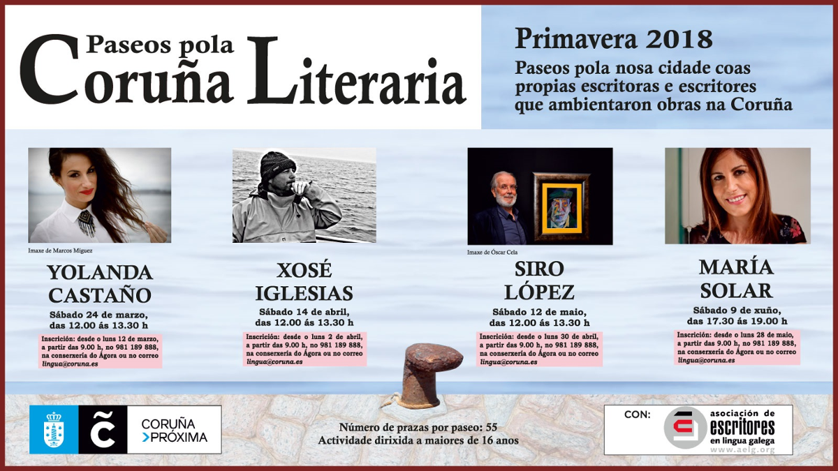 Vuelven los Paseos pola Coruña literaria para conocer una ciudad diferente de la mano de diferentes autoras y autores. Los tradicionales paseos, organizados por el Servizo de Normalización Lingüística del Ayuntamiento de A Coruña junto a la Asociación de Escritores/as en Lingua Galega, se prolongarán durante los meses de marzo a junio y tendrán como primeros protagonistas en este 2018 a Yolanda Castaño, Xosé Iglesias, Siro López y María Solar, que repite con nosotros dadas las solicitudes del año pasado.