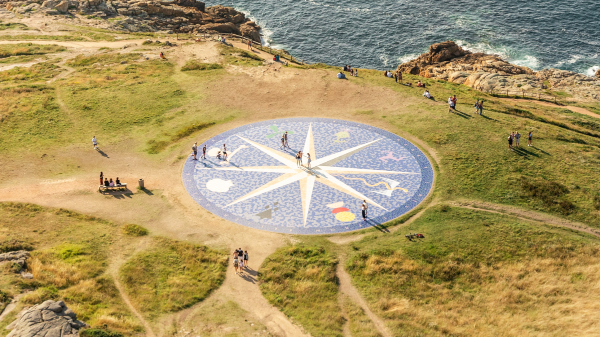 Esta inmensa rosa náutica que conforma una auténtica plaza al pie de la Torre, describe un círculo de 25 metros de diámetro. Construida como un mosaico, está elaborada con granito, pizarra y cerámica vitrificada. Junto a las ocho agujas que indican los puntos cardinales, contiene los símbolos que identifican a las naciones celtas: la vieira, Galicia; la calavera, Tarsis; el trébol, Irlanda; el cardo, Escocia; el trisquel, la isla de Man; el dragón, Gales; el cáliz, Cornualles; el armiño, Bretaña.