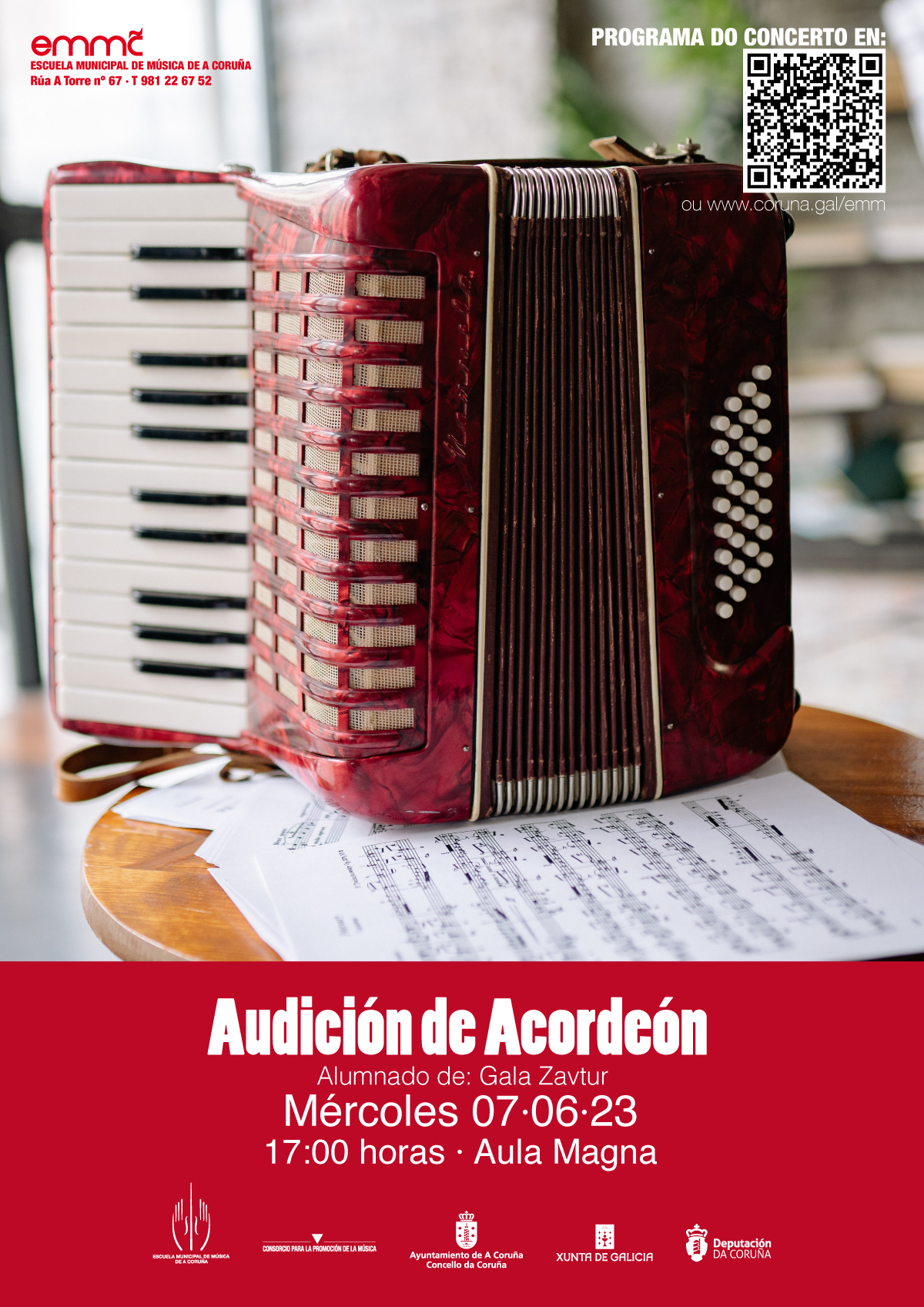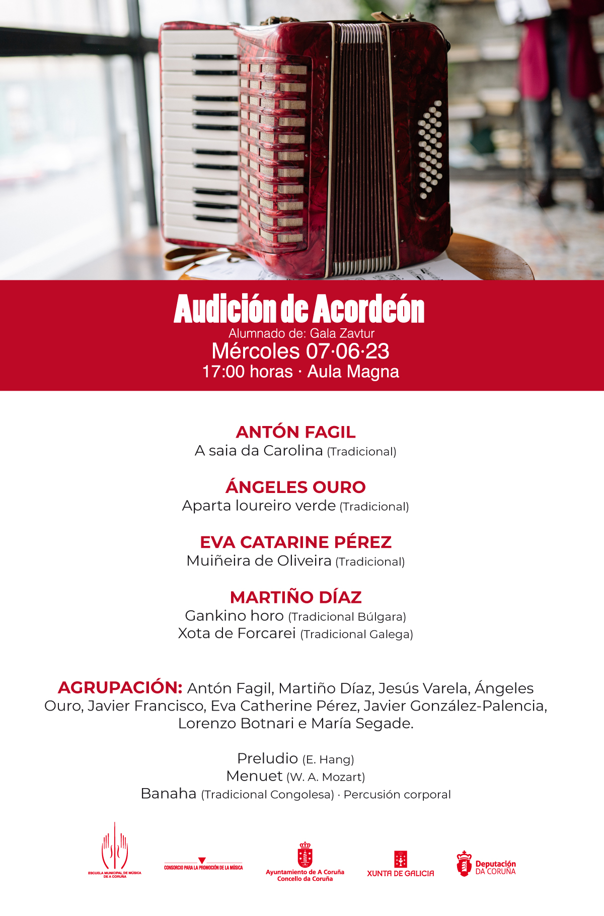 O mércores 7 de xuño o alumnado de Acordeón da profesora Galina Botnar dará un concerto na Aula Magna a partir das 17.00 horas.