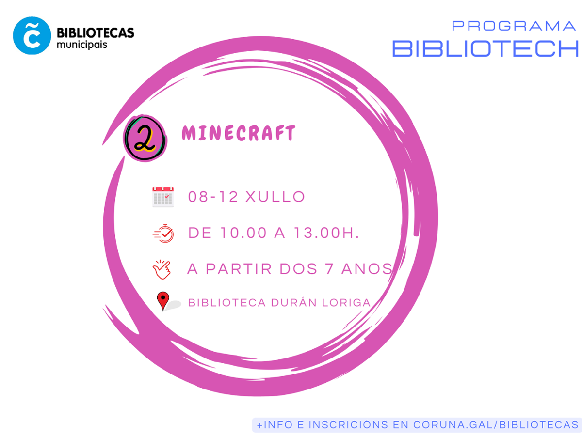 Este é o segundo dos campamentos urbanos que terán lugar na Biblioteca Durán Loriga , dentro do programa BiblioTECH . Un taller de creación e desenvolvemento de mundos virtuais co videoxogo Minecraf.
