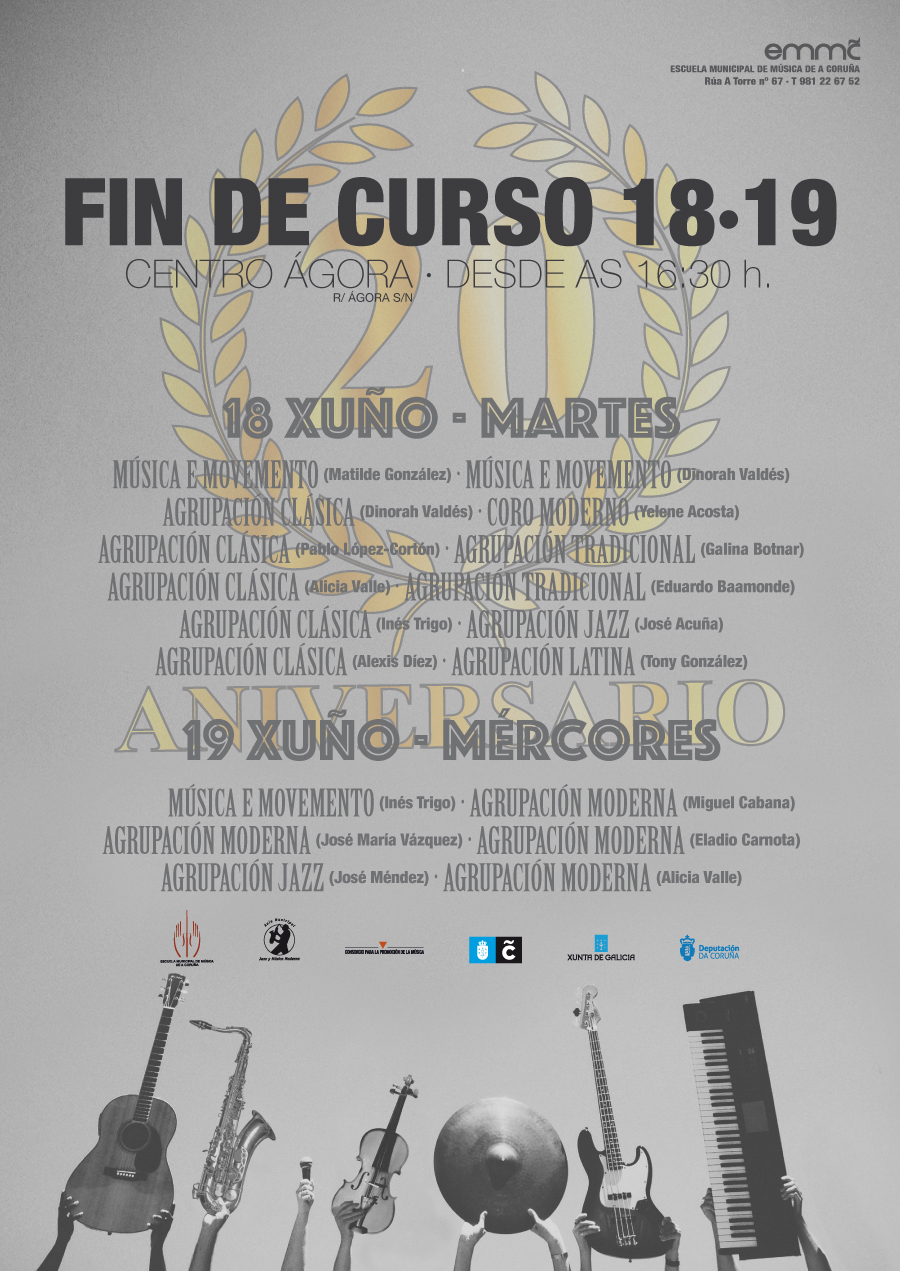 O martes e o mércores, 18 e 19 de xuño, o alumnado da Escola participará no Concerto de fin de curso 2018-19, que terá lugar no Centro Ágora (Lugar da Gramela, 17), a partir das 16:30 horas (ambos os días).