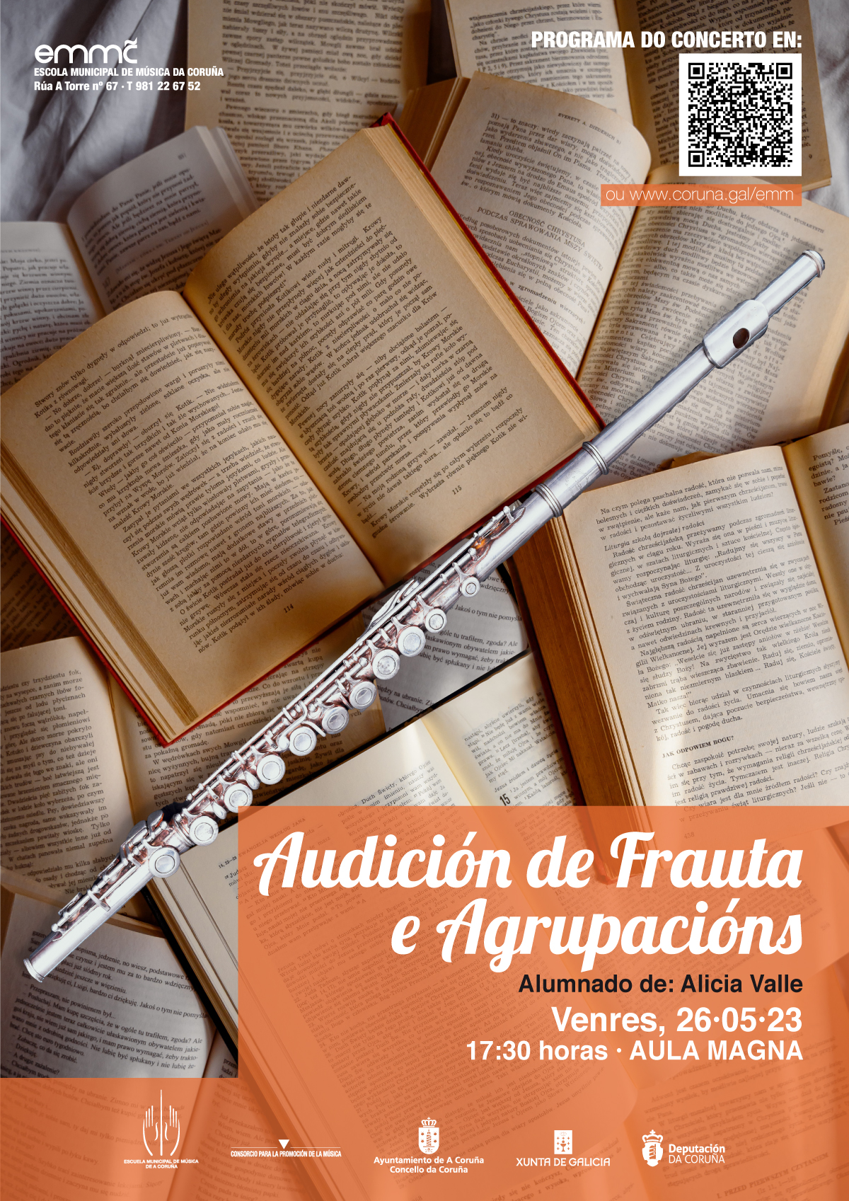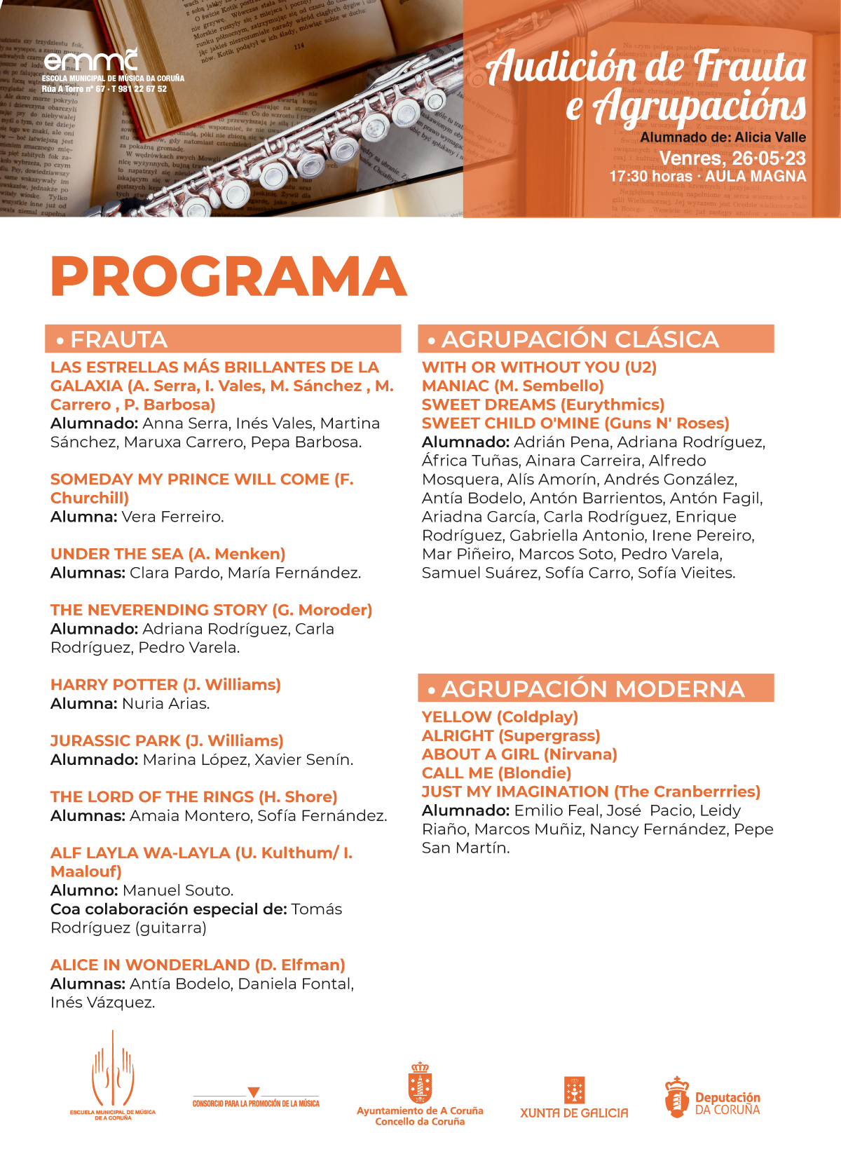 O venres 26 de maio o alumnado de Frauta e Agrupacións da profesora Alicia Valle dará un concerto a partir das 17.30 horas, na Aula Magna.