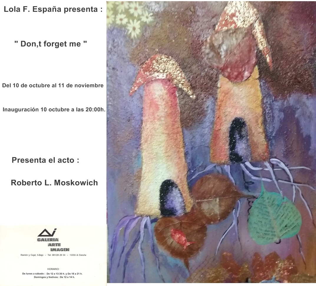 A Galería Arte Imagen inaugura o sábado 10 de outubro ás 20.00 horas a exposición "Don't forget me" de Lola España. Presentará o acto Roberto L. Moskowich.