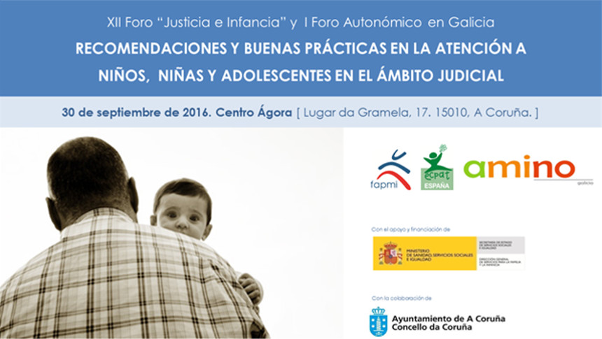 A Federación de Asociacións para a Prevención do Maltrato Infantil (FAPMI-ECPAT España) xunto coa Asociación contra o Abuso e Maltrato Infantil en Galicia (AMINO.Gal), co apoio e financiamento do Ministerio de Sanidade, Servizos Sociais e Igualdade e a colaboración do Concello da Coruña, organizan o XII Foro "Xustiza e Infancia" e o I Foro Autonómico en Galicia que terá lugar na Coruña o vindeiro venres 30 de setembro de 2016.