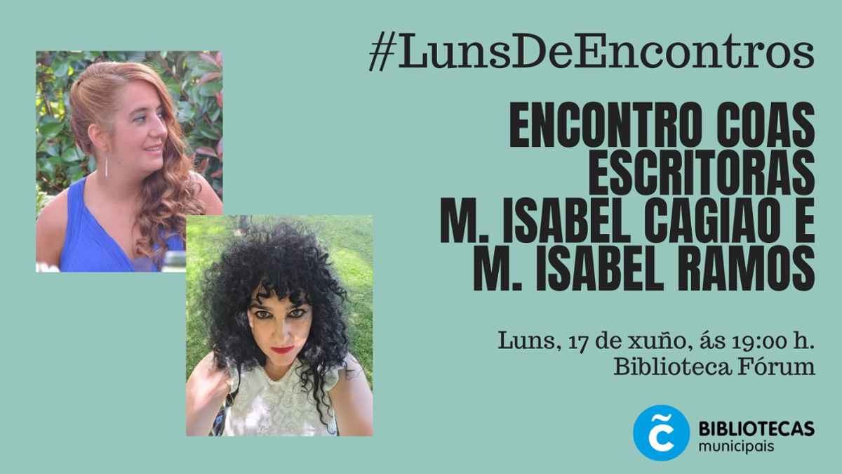 O luns 17 de xuño ás 19.00 h teremos o encontro entre as escritoras María Isabel Cagiao Branco e Isabel Ramos Breijo na Biblioteca Municipal Fórum Metropolitano dentro do Programa #LunsDeEncontros.