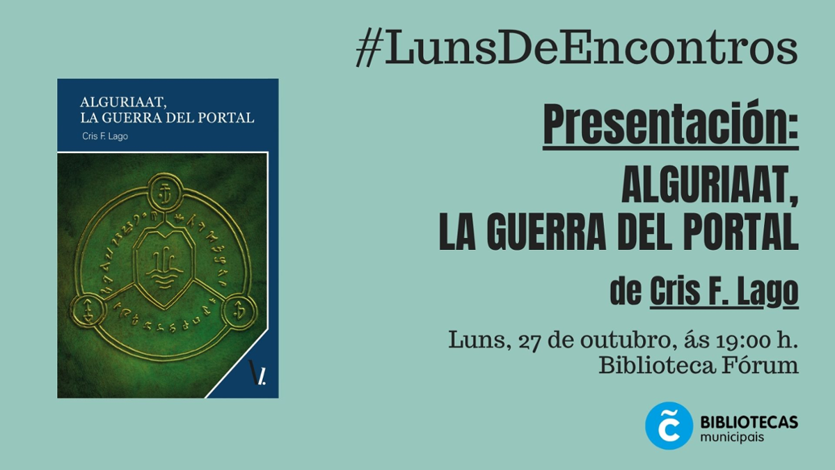El lunes 27 de octubre ás 19 h. en la Biblioteca Municipal Fórum Metropolitano, tenemos la presentación del libro "Alguriaat. La Guerra del Portal" de Cris F. Lago, publicado por Ediciones Oblicuas.