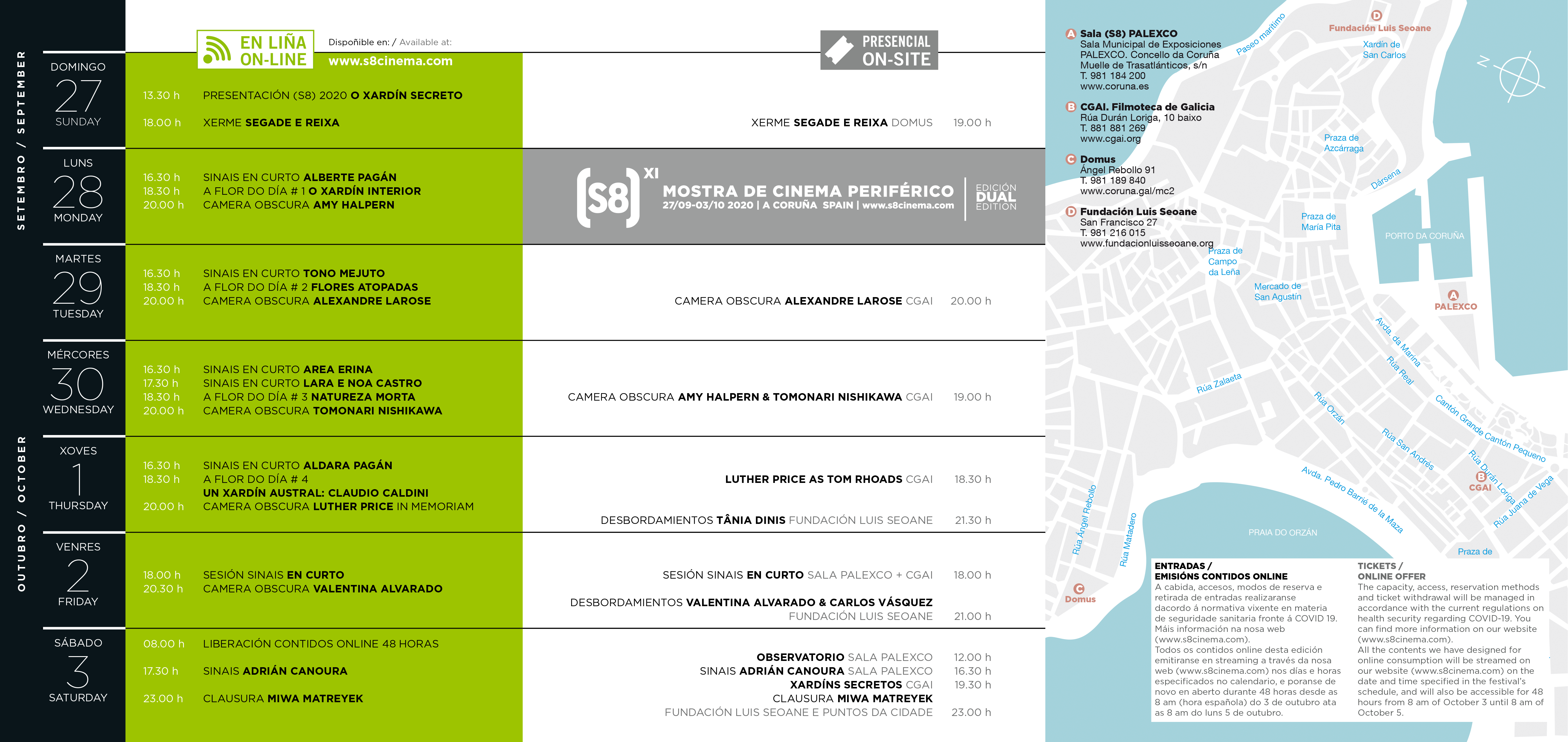 O (S8) Mostra Internacional e Cinema Periférico celebrará entre o 27 de setembro e o 3 de outubro a súa undécima edición explorando un novo formato dual. Nel combinará diversas performances, encontros e proxeccións na cidade da Coruña cunha serie de formatos deseñados para a súa emisión a través da web e as redes sociais do festival.Nesta edición dual, a Mostra amosará máis que nunca o seu carácter internacional: chegará a todos os rincóns do mundo con contidos en galego, castelán e inglés e reforzará especialmente o seu carácter divulgativo. "O (S8) non perderá a súa esencia e continuará a ser un punto de encontro da a comunidade e un espazo para o descubrimento e inspiración de cineastas e artistas. O único que cambiará é que, nesta ocasión, espallaremos os contidos do festival por todo o mundo", afirma Ángel Rueda, director do festival. Deste xeito, a formación de públicos e a descuberta de creadores e creadoras continuarán a ser dous dos eixos principais da programación do evento.O festival contará con seccións xa coñecidas polo público -Xerme, Sinais, Sinais en Curto, Desbordamientos...- pero tamén incorporará varios formatos e contidos novos creados en exclusiva para esta edición. É o caso de Camera Obscura, un novo espazo na rede que nace tomando como referencia o coñecido programa de cine experimental Screening Room. Por este programa, presentado por Robert Gardner de 1972 a 1981 na televisión pública de Boston, pasaron os máis relevantes cineastas de vangarda do seu tempo, a quen o conductor entrevistaba en profundidade ofrecendo tamén aos televidentes a oportunidade de coñecer a súa obra emitindo algunhas das súas pezas. Neste 2020 e pensando en novos xeitos de difundir o cinema experimental, o (S8) recolle o testemuño de Screening Room para crear Camera Obscura, un programa emitido en streaming e cun formato renovado que contará cunha estética peculiar e unha clara vocación creativa.