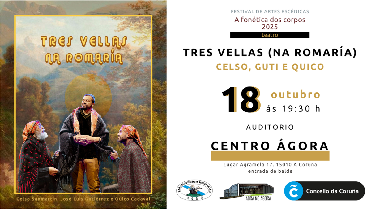 A nova edición do festival "A fonética dos corpos", que conforma o programa Agra no Ágora, tráenos ao barrio da Agra este espectáculo de Producións Teatrais Excéntricas que, segundo algúns dos máis esixentes críticos, é un dos espectáculos máis fermosos dos que podemos gozar na escena galega. Tres dos mellores narradores da escena internacional xuntos falando das súas musas, as súas vellas. Cada función é diferente, única; algunhas vellas repiten, outras non, aparecen e desaparecen da memoria colectiva na maior e máis antiga expresión teatral: a narración oral. O espectáculo da palabra viva, ou mellor, resucitada nas falas de Celso Sanmartín, José Luis Gutiérrez e Quico Cadaval xirou por toda Galiza con esporádicas saídas a Portugal, Castela e León e Cataluña. A materia dos relatos que se presentaban no que parecía unha verdadeira sesión de espiritismo era a vida cotiá, os traballos e os días, os labores, os namoros, e as tristuras, as dores e os divertimentos. A prodixiosa biblioteca do mundo analfabeto na súa infinita riqueza.