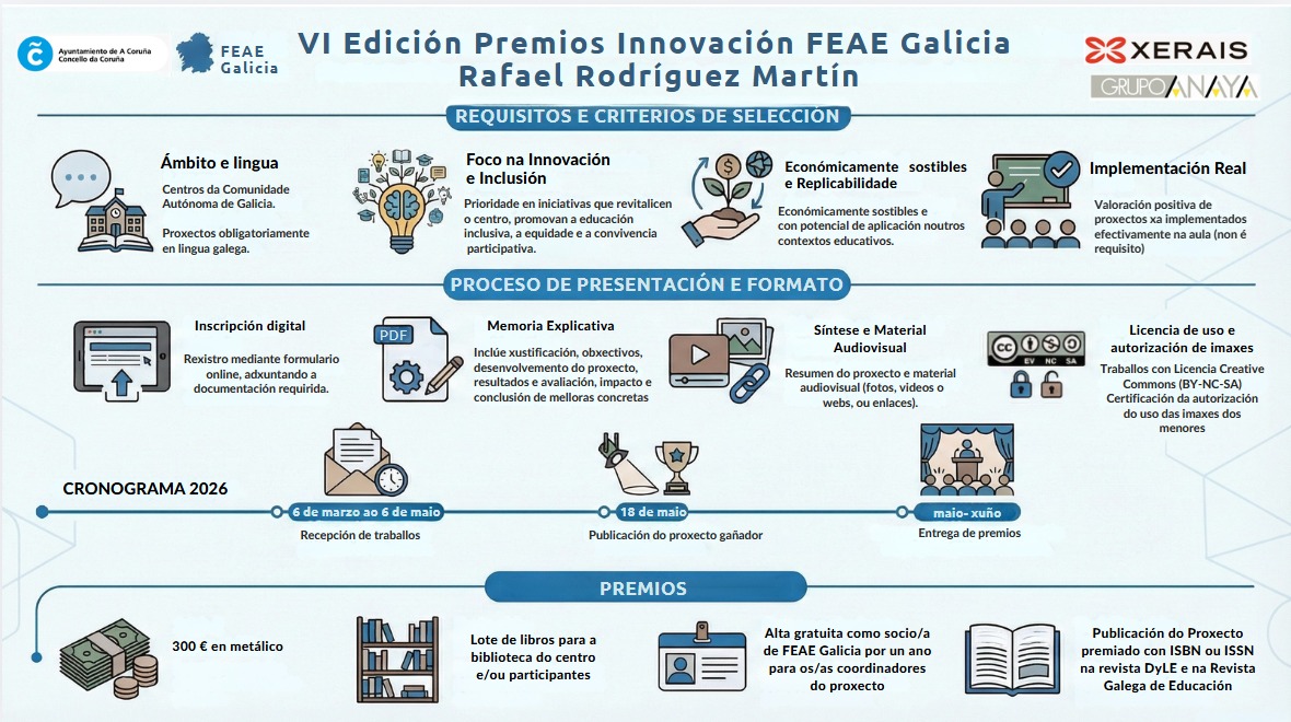 Os Premios de Innovación do Foro Europeo de Educación de Galicia "Rafael Rodríguez Martín", buscan identificar, recoñecer e promover a grupos de docentes comprometidos e comprometidas coa innovación educativa en Galicia, a través do desenvolvemento de iniciativas didácticas que axuden a construír unha rede de propostas educativas que inspiren transformación e innovación e que sexan facilmente transferibles a outras contornas educativas.