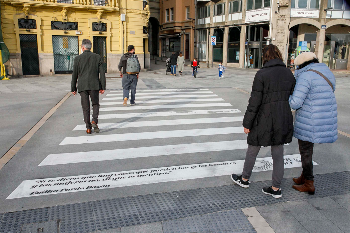 A cidade volve sentir a obra e o recordo de Emilia Pardo Bazán a través de mensaxes pintadas até en 22 pasos peonís con frases dela ou de persoas que a admiran. Son en total once misivas duplicadas ao longo da Coruña, en concreto, nos lugares onde a homenaxeada deixou unha fonda pegada, escenarios da súa Marineda que hoxe rememoran a escrita da coruñesa. Deste xeito, desde a Fábrica de Tabacos, protagonista en varios dos seus libros, até a Porta Real, próxima ao seu fogar, o legado literario de Pardo Bazán estará estes días máis vivo ca nunca. En concreto, persoas expertas como a académica Marilar Aleixandre, a escritora Nieves Abarca e a historiadora Isabel Burdiel completan o tributo coas súas achegas, nunha posta en escena que se enmarca dentro dos actos de conmemoración do centenario do seu pasamento.