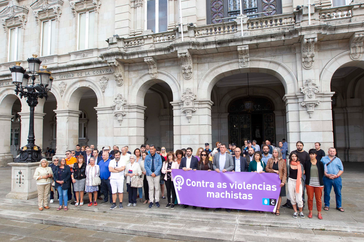 Representantes de todos os partidos da Corporación Municipal congregáronse ás 12.00 horas na praza de María Pita nun minuto de silencio en repulsa da violencia machista polo triplo asasinato de tres mulleres cometido onte en Valga, Pontevedra.