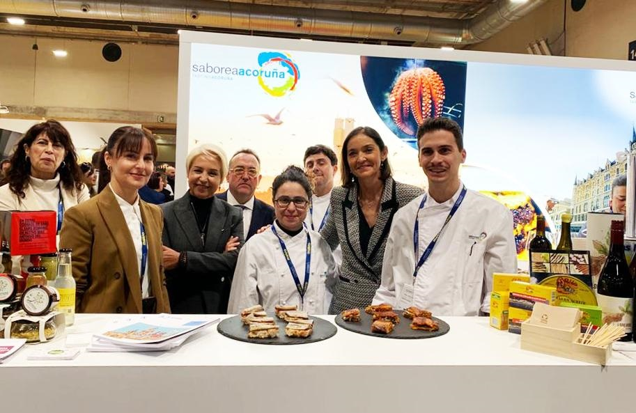 A delegación coruñesa na feira, encabezada polos chefs Sheila Barbeito e Gonzalo Cotelo, mostrou ante Reyes Maroto a oferta gastronómica da cidade