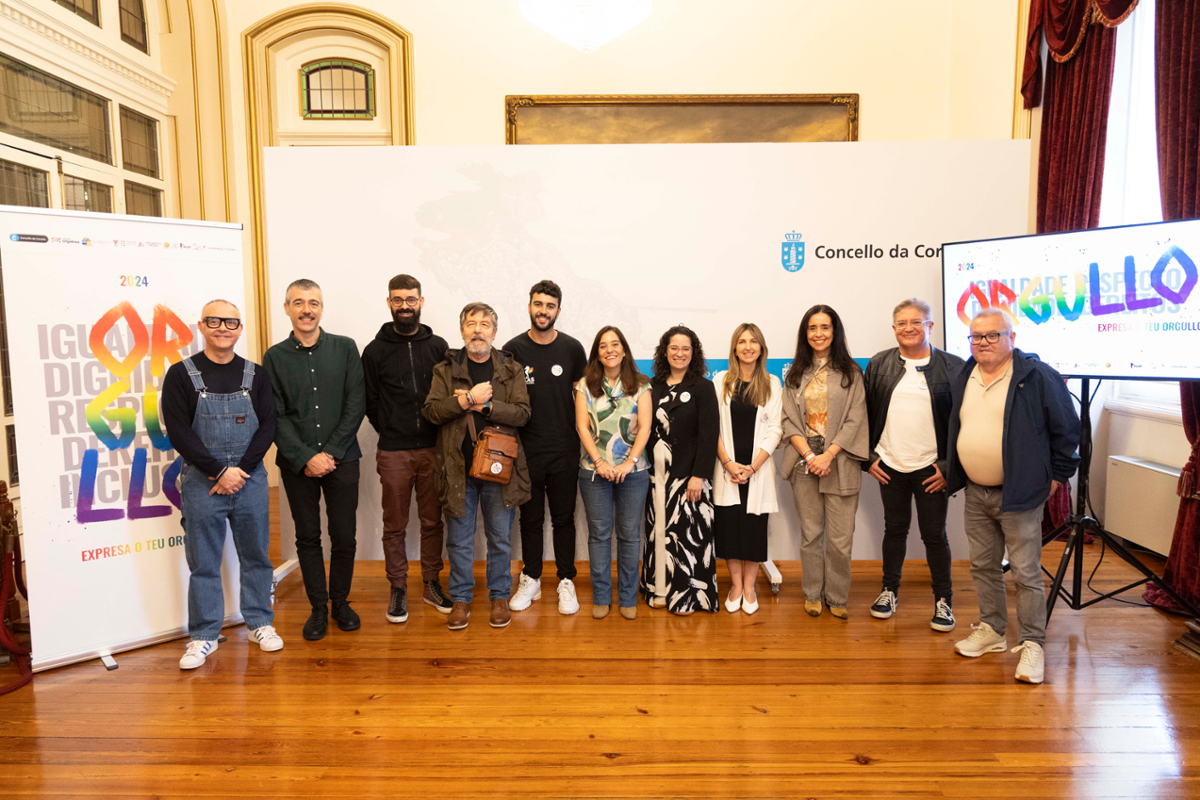 A alcaldesa, Inés Rey, presentou esta mañá a programación do Orgullo coruñés, que comezará este sábado 22 de xuño e que se prolongará ata o 10 de xullo. A alcaldesa estivo acompañada de persoas responsables de distintas entidades da cidade e de Galicia que colaboraron na elaboración das actividades, representantes das entidades veciñais que participan nesta edición e as concelleiras Yoya Neira e Nereida Canosa.