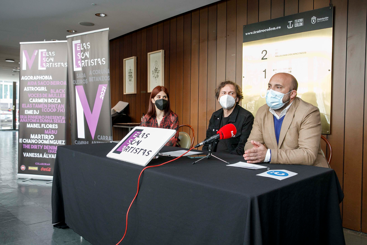 O vestíbulo do Teatro Colón acolleu esta mañá a presentación do Festival Elas son artistas, en que participou o voceiro do Goberno local, José Manuel Lage Tuñas, xunto co director do festival, Tomi Legido, a directora de Comunicación, Beatriz Camiña, e representantes dos concellos de Oleiros, Arteixo, Betanzos, Carral, Cambre, Sada e Bergondo. Nesta cuarta edición, o ciclo pola igualdade nas artes e na música desenvolverase do 16 de abril até o 31 de decembro en 15 sedes diferentes da área metropolitana da Coruña.