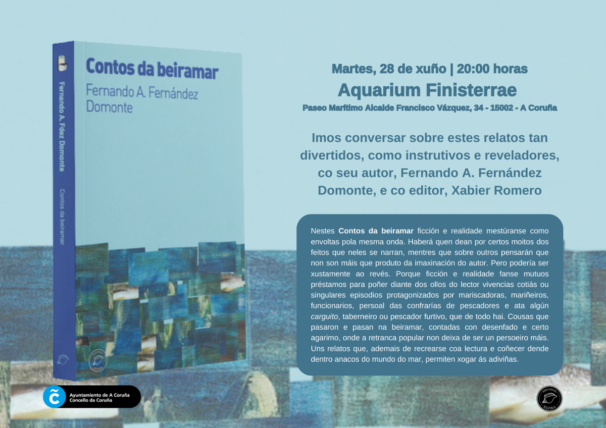 O Aquarium Finisterrae da Coruña acollerá este martes 28 de xuño unha presentación literaria moi vencellada co mundo marítimo. Trátase do libro 'Contos da beiramar', do autor Fernando A. Fernández Domonte. O escritor explicará todos os detalles da súa obra a partir das 20.00 horas no Museo Científico Coruñés.