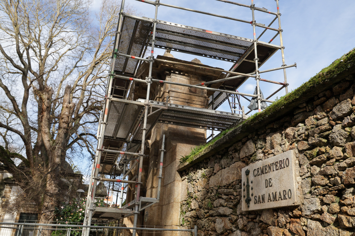 O Concello comezou a restauración da porta principal que dá acceso ao cemiterio municipal de San Amaro. A porta instalouse en 1833 con motivo da primeira ampliación do camposanto debido ao aumento da mortalidade por mor dun brote de cólera e da prohibición dos enterramentos parroquiais. O deseño da ampliación incluía tamén un osario e unha capela e o traslado do acceso principal desde o eixe central do camposanto a un dos laterais, que é a súa localización actual.