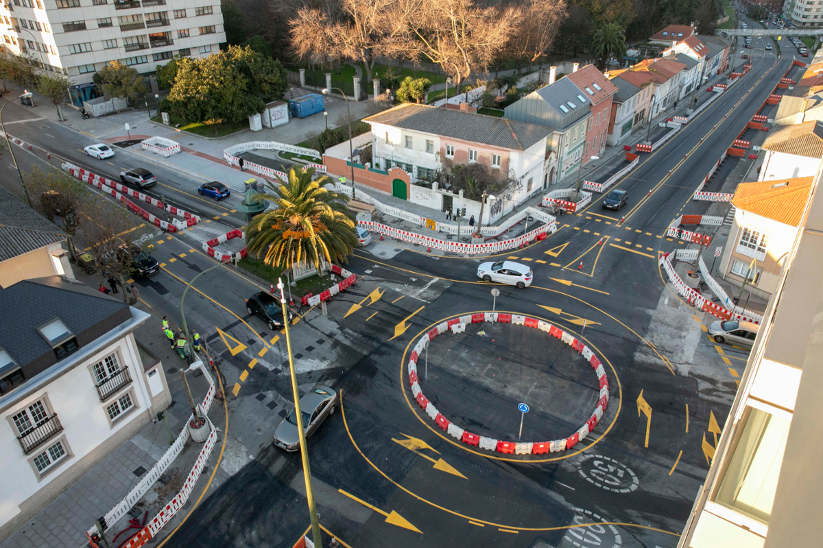 O Concello da Coruña avanza no proxecto de reurbanización e humanización do cruzamento entre a avenida de Arteixo e a rolda de Nelle, que este venres reabriu ao paso do tráfico rodado tras dous meses e medio de traballos e a disposición dunha nova rotonda, xa operativa baixo un deseño provisional, con pintura e sinalización amarela de obra, e coa regulación semafórica definitiva.