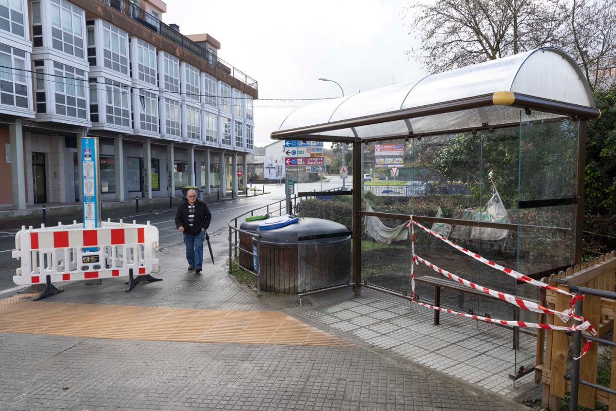 Para a instalación da estrutura leváronse a cabo traballos previos de acondicionamento da beirarrúa, retirando os morróns existentes para a separación coa estrada en substitución de firme podotáctil, facéndoa máis accesible para as persoas con discapacidade visual. Ademais incluíuse pavimento direccional entre a marquesiña e a liña podotáctil, ambos os dúas en cor amarela, completando a mellora da accesibilidade.