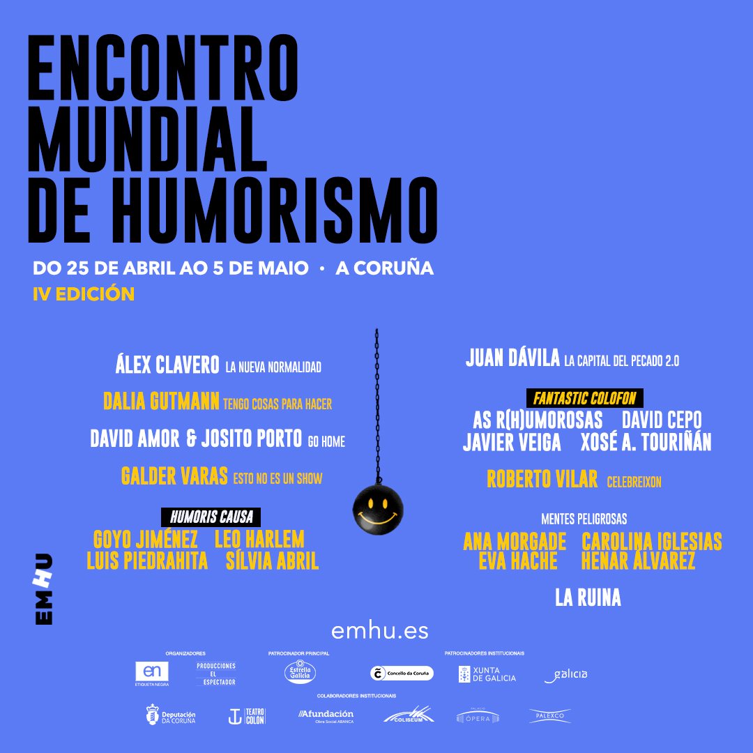 O Encontro Mundial de Humorismo avanza este mércores a programación da súa cuarta edición, que terá lugar na Coruña do 25 de abril ao 5 de maio de 2024. Álex Clavero, Ana Morgade, Carolina Iglesias, Dalia Gutmann, David Amor, David Cepo, Eva Hache, Galder Varas, Goyo Jiménez, Henar Álvarez, Ignasi Taltavull, Javier Veiga, Juan Dávila, Leo Harlem, Luis Piedrahita, Roberto Vilar, Sílvia Abril, Tomàs Fuentes, Xosé A. Touriñán e As R(h)umorosas (Carmen Méndez, Ledicia Sola e Marta Doviro) son os primeiros nomes que se dan a coñecer do cartel do EMHU 2024, cuxas entradas sairán á venda este venres, 22 de decembro, a partir das 11.00 horas, na páxina web oficial www.ehmu.es e na plataforma en liña www.ataquilla.com.