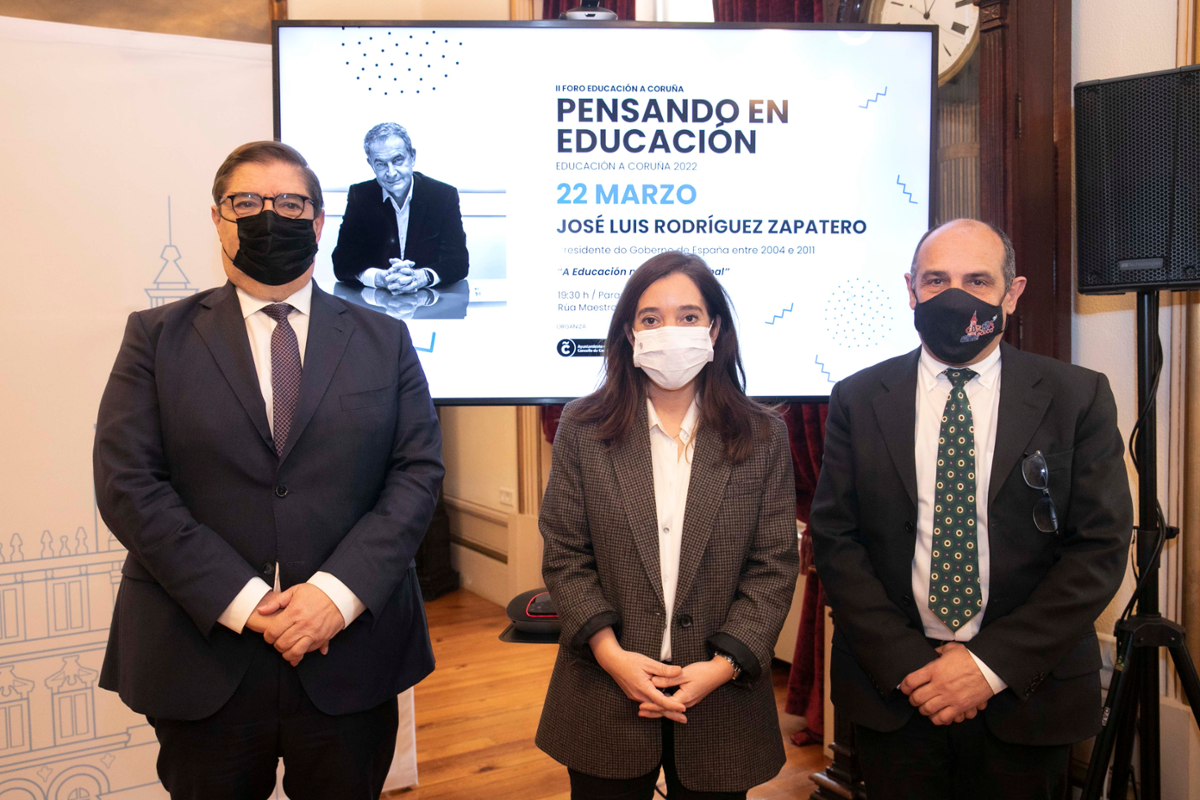 A alcaldesa, Inés Rey, e o concelleiro de Educación, Memoria Histórica, Innovación, Industria e Emprego, Jesús Celemín, acompañados polo reitor da Universidade da Coruña (UDC), Julio Abalde, presentaron hoxe en María Pita a primeira das conferencias do II Foro Pensando en Educación, coorganizado polo Concello e a UDC, e que contará con José Luis Rodríguez Zapatero, presidente do Goberno entre os anos 2004 e 2011, como o relator inaugural na edición deste ano.