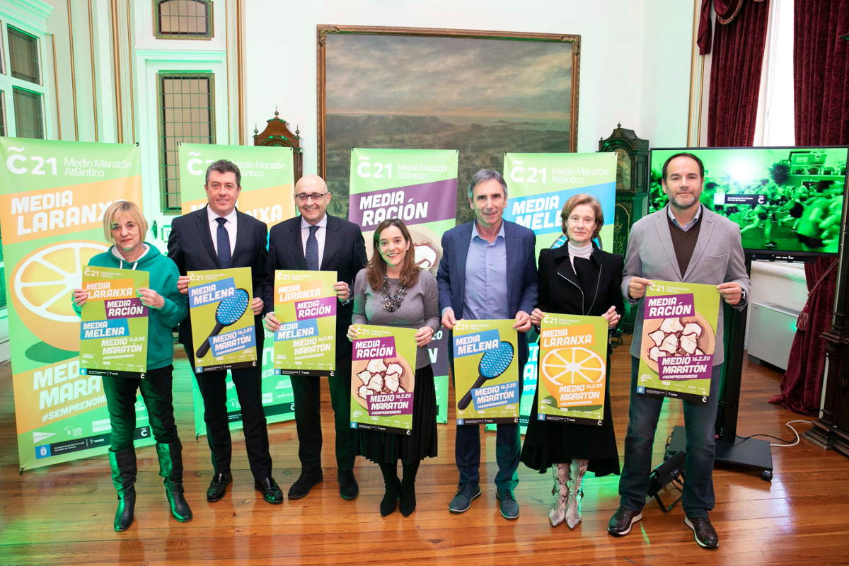 María Pita foi hoxe o escenario da presentación dunha nova edición do Medio Maratón Coruña 21, que percorrerá a cidade o 16 de febreiro a partir das 10.00 horas, con saída do Obelisco. A C21, organizada polo Concello da Coruña e a Federación Galega de Atletismo, presenta a súa cara máis ecolóxica e sustentable. As/os deportistas lucirán dorsais elaborados con papel reciclado e nas zonas de avituallamento utilizaranse bolsas biodegradables, Ademais, todas/os os atletas que cheguen á meta recibirán unha medalla finisher de madeira. A organización tamén designará xuízas e xuíces específicos que velarán pola xestión correcta dos residuos por parte das persoas participantes e realizarán enquisas para coñecer o medio de transporte que utilizaron para se desprazaren á carreira.