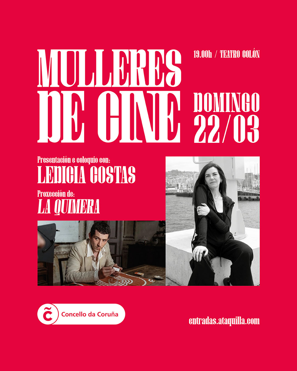 O ciclo contou ata o de agora coa participación de Aida Tarrío, María Vázquez, Bea Lema e Candela Sierra. Este domingo, a escritora Ledicia Costas pecha o ciclo presentando a proxección de 'La quimera', de Alice Rohrwacher. A sesión será ás 19.00 horas e as últimas entradas continúan á venda a través de Ataquilla, na praza de Ourense e, o día da función, no despacho de billetes do Teatro Colón.