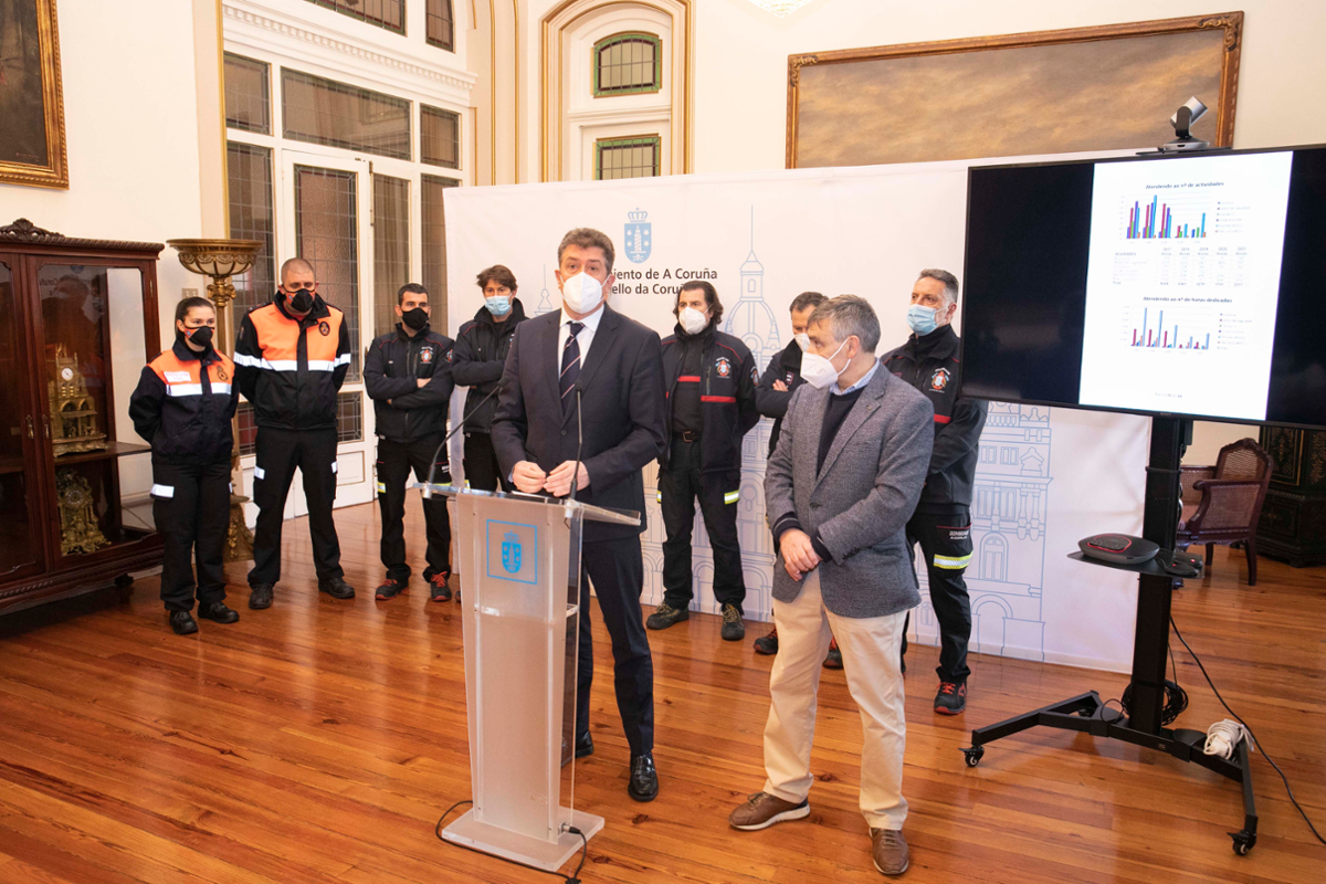 Durante o ano pasado, o servizo municipal de Bombeiros levou a cabo 1.721 intervencións, volvendo aos niveis dos anos 2017-18, aínda que en cifras inferiores ás do ano 2019. Cabe destacar, neste sentido, a eficiencia nas intervencións executadas: nun 80,94 % dos casos, os profesionais do servizo chegaron ao lugar do sinistro en menos de 12 minutos; e nun 15,25 %, en menos de 5 minutos. "Non só e importante o número de intervencións, que dá idea do esforzo dos nosos bombeiros, senón que ademais téntase facer un traballo con calidade", agregou Borrego. Das 1.721 intervencións, 659 solucionáronse en menos de media hora. A gran maioría delas, de carácter urxente, segundo explicou o director de Seguridade Cidadá, Carlos García Touriñán.