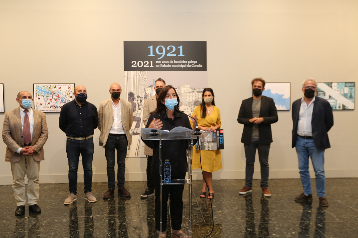 A alcaldesa, Inés Rey, inaugurou esta tarde en María Pita a exposición "1921-2021. 100 anos da bandeira galega no Pazo Municipal", comisariada por Manel Cráneo e Henrique Torreiro.