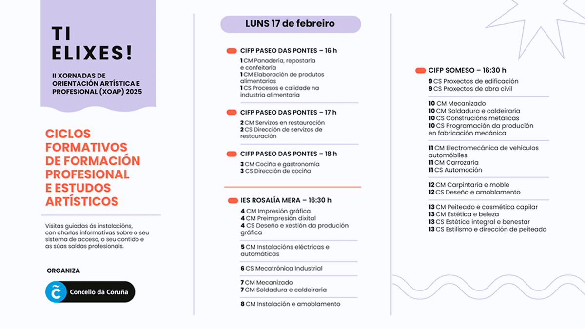As II Xornadas de Orientación Artística e Profesional (XOAP 2025), organizadas polo Servizo Municipal de Educación do Concello da Coruña co obxectivo de informar sobre os estudos Superiores de Deseño e os ciclos de Formación Profesional e ensinos Artísticos (ordinaria e básica) que se imparten nos centros públicos da cidade, arrincan o vindeiro luns 17 de febreiro.