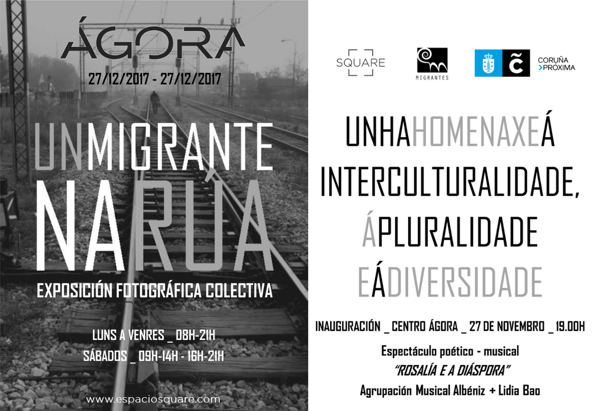 El Centro Ágora acogerá desde mañana la muestra itinerante de fotografía colectiva Un migrante na rúa, una propuesta que se define como "un homenaje a la interculturalidad, a la pluralidad y a la diversidad". El trabajo, promovido por la entidad Square y el colectivo Migrantes, aúna el trabajo de 25 artistas que, a través de sus imágenes, quieren concienciar sobre la realidad de la migración como fenómeno mundial "presente en todas las épocas de la historia y en todas partes de nuestro planeta. Así, en esta exposición se mostrarán 25 piezas de Alicia Martínez Núñez, Andrés Fernández, Antía García Sendono, Begoña Bah, Belén Canosa, Carlos Durán López, César Charlón, Chico Mirás, Elena Pérez-Ardá López, Gimena Berenguer, Irene López, José Alberto Pedrido, José Padrín, Kike G. Pérez, Lestonnac Ibáñez Vilas, Moncho Fuentes, Paco Gallego, Pepe Ventureira Maceiras, Santiago Ramas, Santiago Rodríguez, Uxía Saborido, Xabier Martínez, Xoana Grela, Xosé Luís Alonso y Yanina Tuirán. Cada fotografía está apadrinada por alguna entidad local del tejido social, cultural o empresarial de A Coruña.