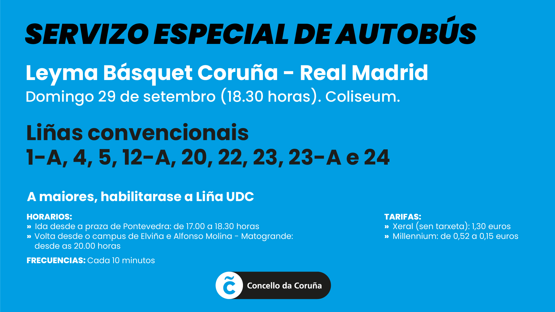 Este domingo haberá, pois, un total de dez liñas dispoñibles para viaxar ás inmediacións do Coliseum e a súa contorna. Son as liñas 1-A, 4, 5, 12-A, 20, 22, 23, 23-A e 24, ás que se sumará a da UDC.